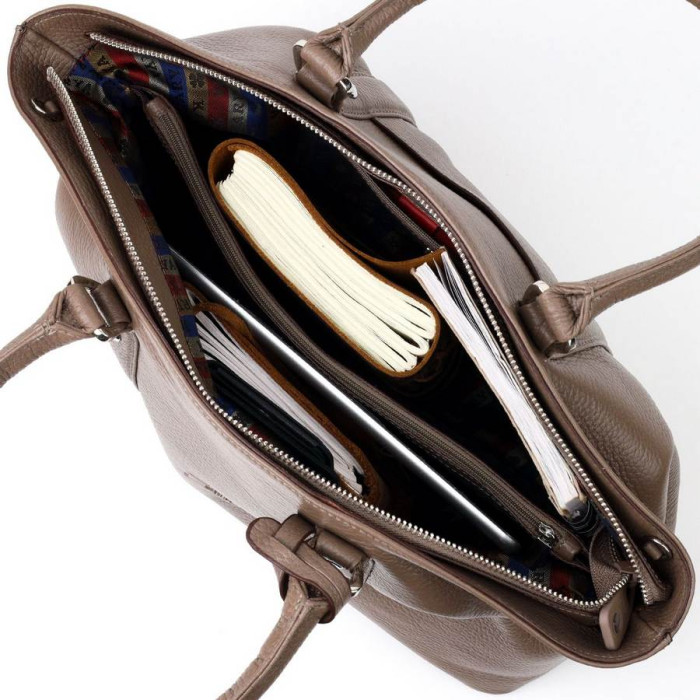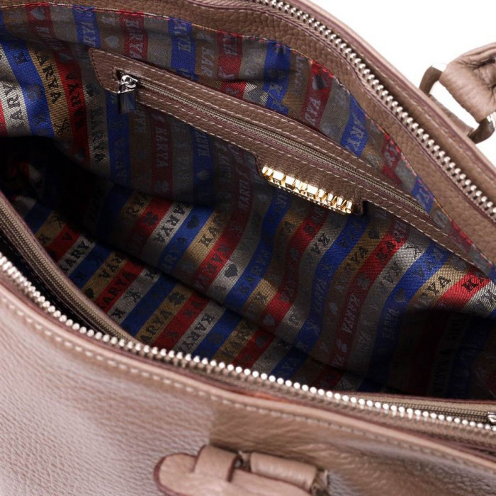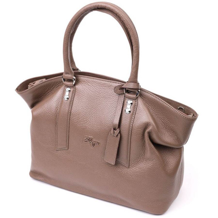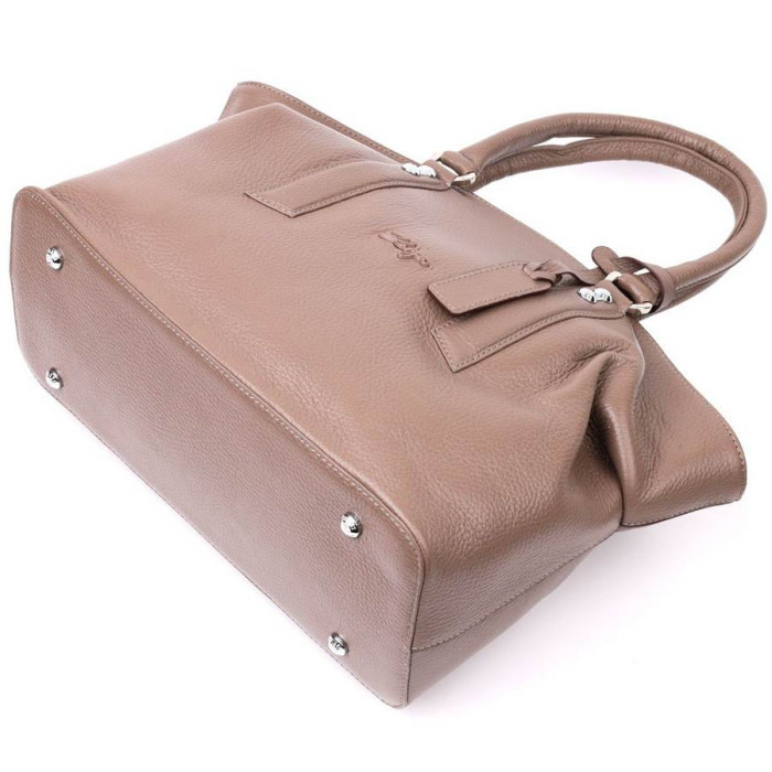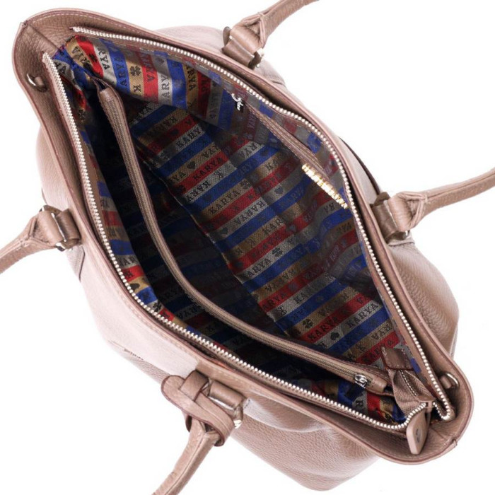 Оригінальна жіноча сумка в діловому стилі з натуральної шкіри, в стильному дизайні та ніжному бежевому кольорі. Фурнітура срібного кольору. Сумку зручно носити у руці, на плечі. Сумка упакована у фірмовий текстильний чохол Karya. Сумка з натуральної шкіри завжди буде чудовим подарунком будь-якій жінці.
