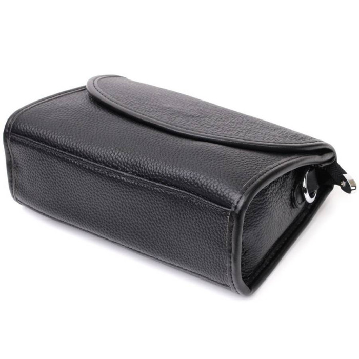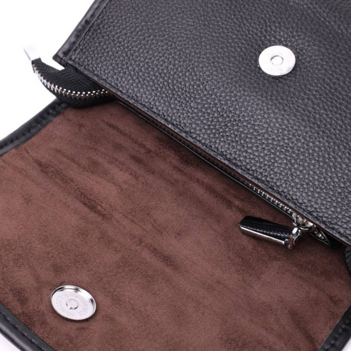 Компактна сумочка в чорному кольорі, яка закривається на блискавку і стильний напівкруглий клапан на магніті. Виріб пошитий з якісної натуральної м'якої шкіри, яка довго носиться і не втрачає свого первісного вигляду. Аксесуар складається з основного відділення та потайної кишені на блискавці. Носити сумку можна під рукою, на плечі і через плече, для цього є шкіряний ремінь, що знімається регульований. У виробі використано якісну фурнітуру срібного кольору. Універсальний варіант сумки, який підійде для вечора, а також відмінно підійде на кожен день.