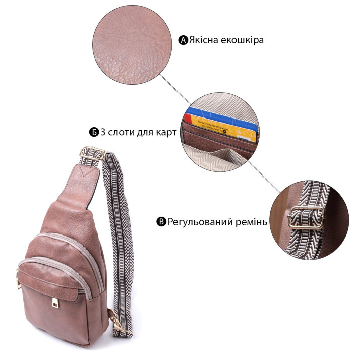 Стильний варіант сумки для жінок на кожен день із якісної екошкіри, яка є альтернативою натуральній шкірі. Дана модель складається з одного основного відділення, яке закривається на блискавку і в якому знаходиться кишеня на блискавці і три кишені для кредитних карток усередині, а також трьох кишень зовні та одного отвору для кабелю або навушників, що дуже зручно в сучасному світі. Акцентом даної моделі є зручний регульований плечовий ремінець у етнічному стилі, що дуже модно вже кілька сезонів. Екошкіра - високоякісна альтернатива натуральному матеріалу, яка дуже стійка до тертя, до низьких температур, відмінно носиться на відміну від інших штучних матеріалів, а також має гіпоалергенний склад на відміну від натуральної шкіри. Мода не стоїть на місці, на зміну класичним сумкам приходять нові моделі, які обумовлені сучасним часом, саме такою є слінг сумка - зручна, практична, невелика, але містка і головне якісна.