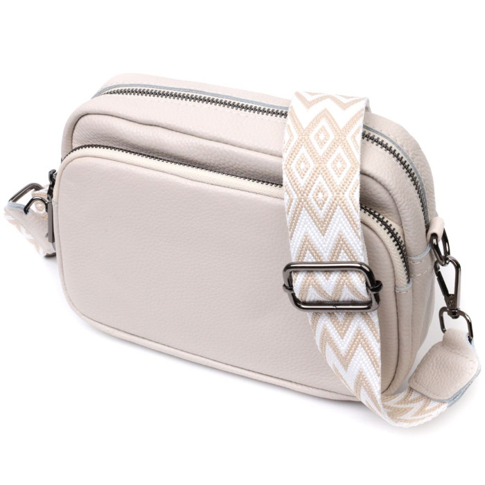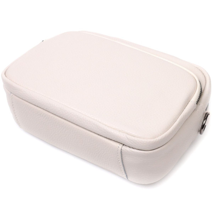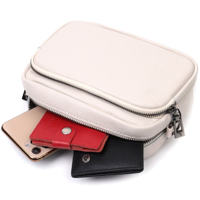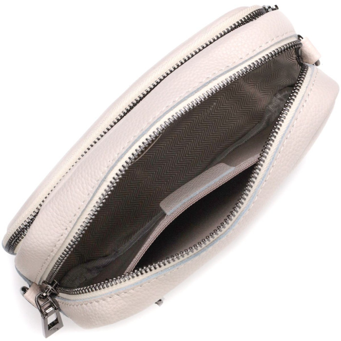 Стильна сумка з накладною кишенею на лицьовій стороні. Виріб пошитий з якісної натуральної шкіри, яка довго носиться і не втрачає свого первісного вигляду. Аксесуар складається з одного основного відділення всередині якого розташована кишеня відкритого типу і кишеня на блискавці, також зовні розташована кишеня на блискавці, на тильній стороні та накладна кишеня на блискавці, на лицьовій стороні. Носити сумку можна в руці як клатч, на плечі та через плече, для цього є текстильний ремінь, що знімається. У виробі використано якісну фурнітуру кольору темного срібла. Універсальний варіант сумки як на вечір так і як сумочка на кожен день.