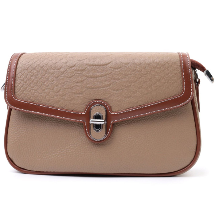 Стильная каркасная женская сумка из натуральной кожи. В изделии использована кожа бежевого и коричневого цвета. Притягує погляд у виробі фактурний клапан із тисненням під змію та витончена механічна клямка. Аксесуар складається з основного відділення, кишені-перегородки на блискавці, потайної кишені на блискавці та кишені відкритого типу, а також ще однієї кишені зовні, на тильній стороні. Носити сумку можна в руці, під рукою, на плечі і через плече, для цього є шкіряний ремінь, що знімається. В аксесуарі використано якісну фурнітуру кольору срібла. Універсальний варіант сумки на вечір, на щодня, а також буде відмінно поєднуватиметься з діловим стилем.