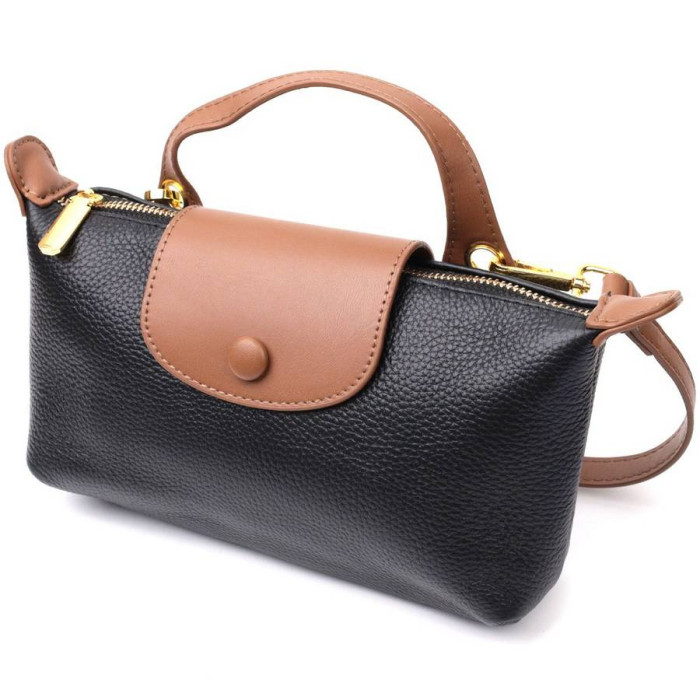 Компактна жіноча сумка з натуральної шкіри флотар, яка невибаглива у догляді та довго носиться. Аксесуар складається з двох невеликих відділень, двох кишень на блискавках та кишені відкритого типу. Носити сумку можна в руці, під рукою, на плечі і через плече, для цього є шкіряна ручка і шкіряний ремінь, що знімається. В аксесуарі використано якісну фурнітуру кольору жовтого золота. Універсальний варіант сумки на вечір, щодня, а також відмінно поєднуватиметься з діловим стилем.