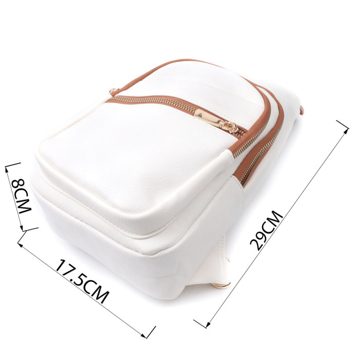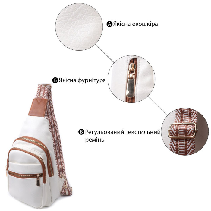 Пропонуємо до Вашої уваги зручну слінг сумку з екошкіри в поєднанні білого та коричневого кольору. Дана модель складається з одного основного відділення, яке закривається на блискавку і в якому знаходиться кишеня на блискавці та кишеня відкритого типу всередині, а також чотирьох кишень зовні та одного отвору для кабелю або навушників, що дуже зручно в сучасному світі. Основною фішкою моделі є зручний регульований плечовий ремінець у етнічному стилі, що дуже модно вже кілька сезонів. Екошкіра – високоякісна альтернатива натуральному матеріалу, яка дуже стійка до тертя, до низьких температур, відмінно носиться на відміну від інших штучних матеріалів, а також має гіпоалергенний склад на відміну від натуральної шкіри.