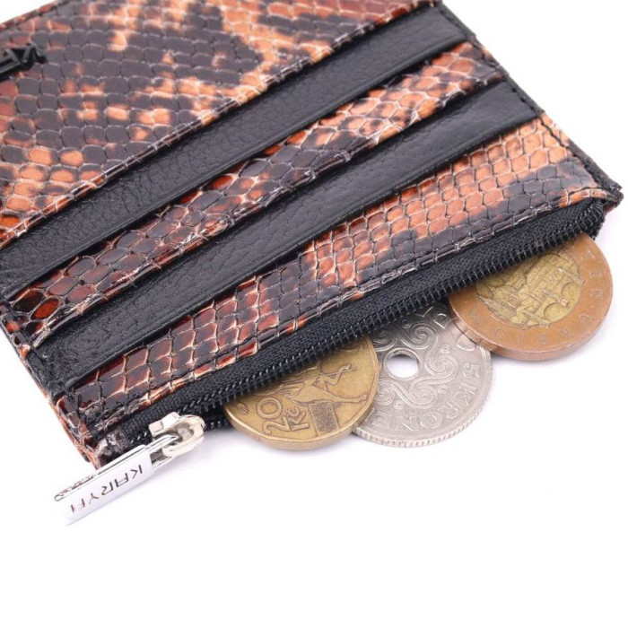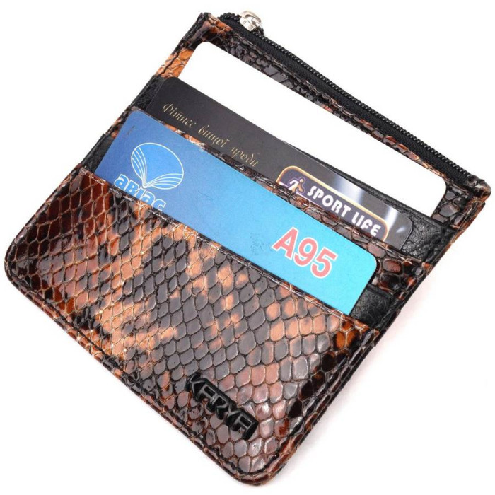 Гарний картхолдер із комбінації двох видів натуральної шкіри, зернистої та з тисненням під змію. Аксесуар упакований у фірмову коробочку. Вироби з натуральної шкіри завжди будуть чудовим подарунком для близької людини.