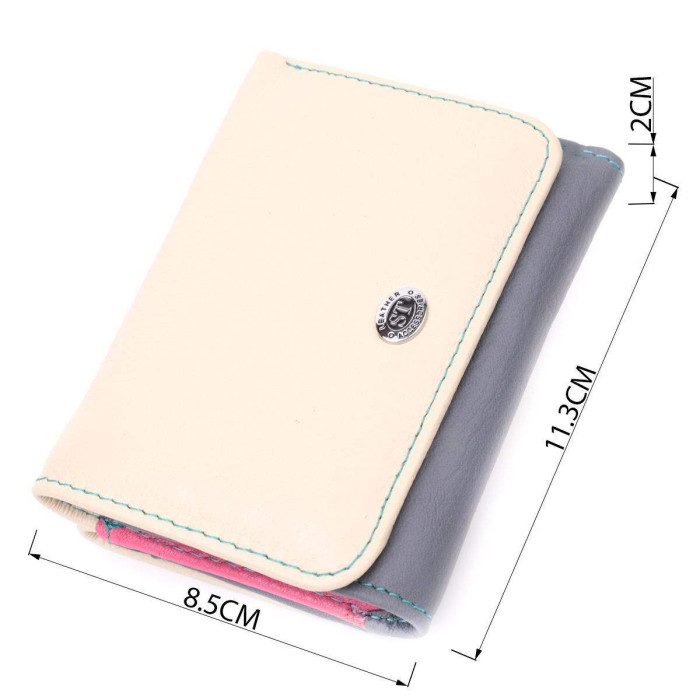 Красивий жіночий гаманець середнього розміру із натуральної шкіри. Відмінна риса цього гаманця двокольорова зовнішня частина та багатобарвна внутрішня частина. Дана модель потрійного додавання, яка закривається на клапан з магнітом. Усередині є два відділення для купюр, монетниця, п'ять слотів під пластикові карти, одне віконце для фото, а також два приховані відділення. Відмінний функціонал та зручний розмір створює ідеальну модель гаманця для повсякденного використання.