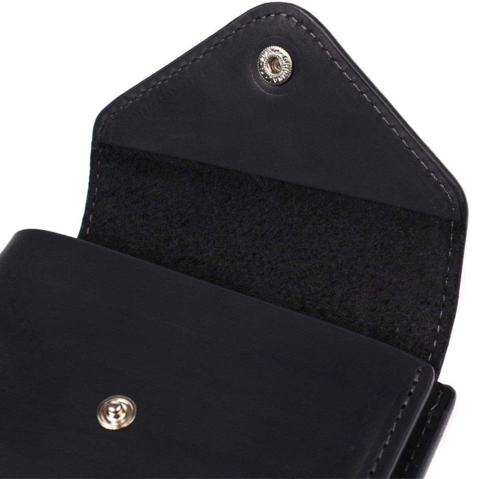Невелике горизонтальне портмоне, виготовлене тільки з натуральної шкіри найвищої якості, без тканинної підкладки. Виріб виконаний у вінтажній шкірі, яка має підвищену міцність завдяки оригінальній фінішній обробці "крейзі хорс". Фішкою цього гаманця є трикутний клапан зверху, на який закривається аксесуар. Дане портмоне ідеальний варіант для сучасної людини, яка вважає за краще носити мінімум готівки і вибирає картки. Портмоне упаковане у фірмову коробку. Дане портмоне стане найкращим подарунком для ваших близьких.