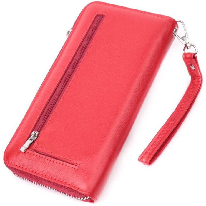 Яскравий клатч для ділової та стильної жінки з натуральної шкіри. Аксесуар має три великі відділення для купюр, вісім осередків для карток, дві прилеглі кишені, одну приховану кишеню, кишеню на блискавці та монетницю на блискавці зовні. Носити цю модель зручно в руці або за допомогою знімного кистьового ременя. Закривається аксесуар на блискавку. Купуючи шкіряний аксесуар цієї фірми собі або на подарунок, будьте певні, що він радуватиме око не один рік