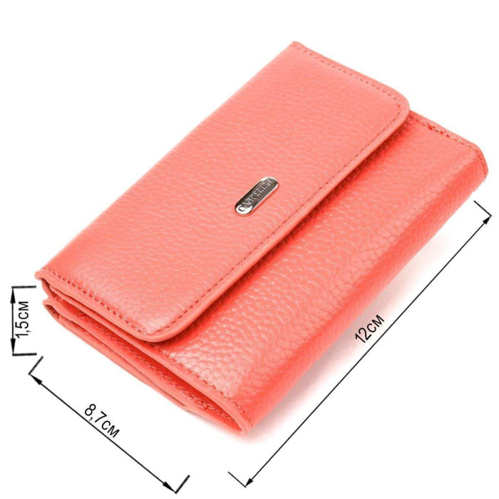 Дуже ніжний гаманець із натуральної зернистої шкіри флотар. Аксесуар має одне основне відділення, в яке розміщуються купюри всіх номіналів, сім кишень для карток, одна з яких під сіточкою, монетниця із зовнішнього боку, а також три приховані кишені. Закривається аксесуар клапаном на кнопку, як і монетниця. Колір фурнітури – срібло. Шкіряний гаманець високої якості завжди буде гідним подарунком для рідних та близьких людей.