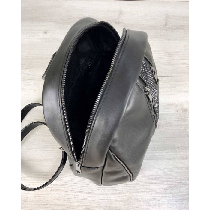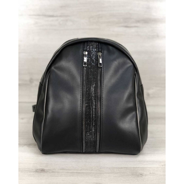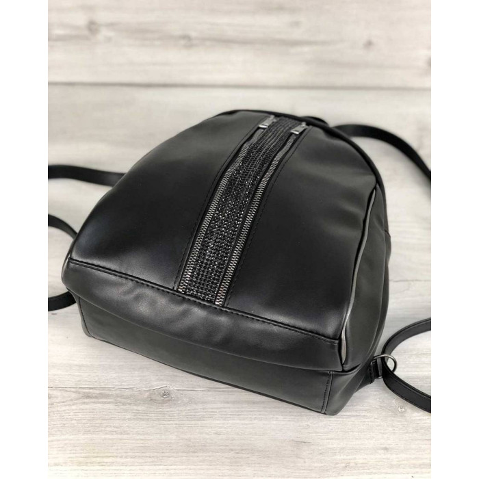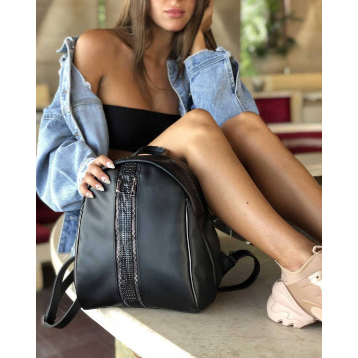 Рюкзак прикрашений смужкою з чорних каменів, які переливаються на світлі.
