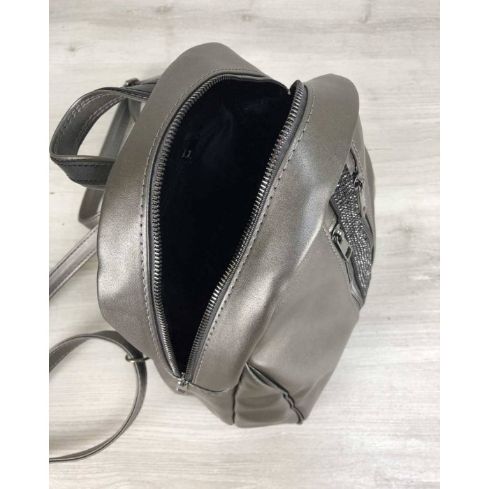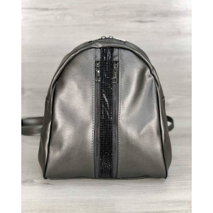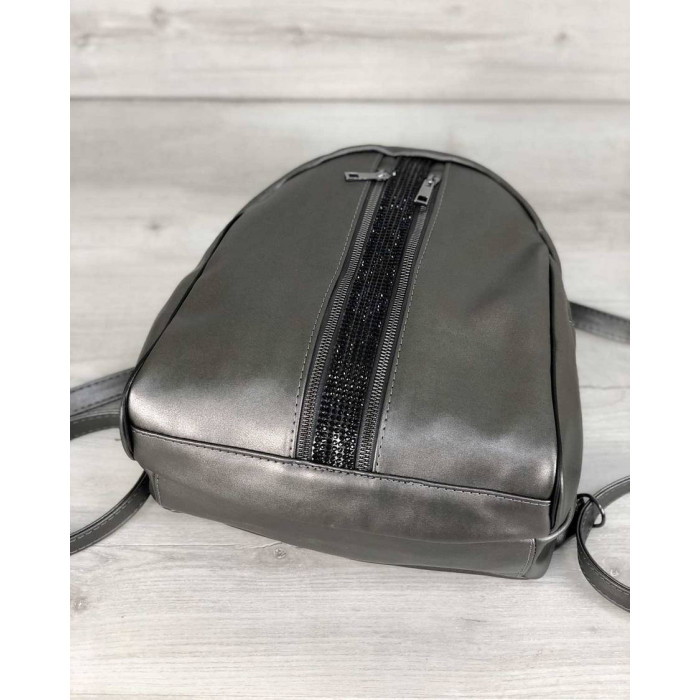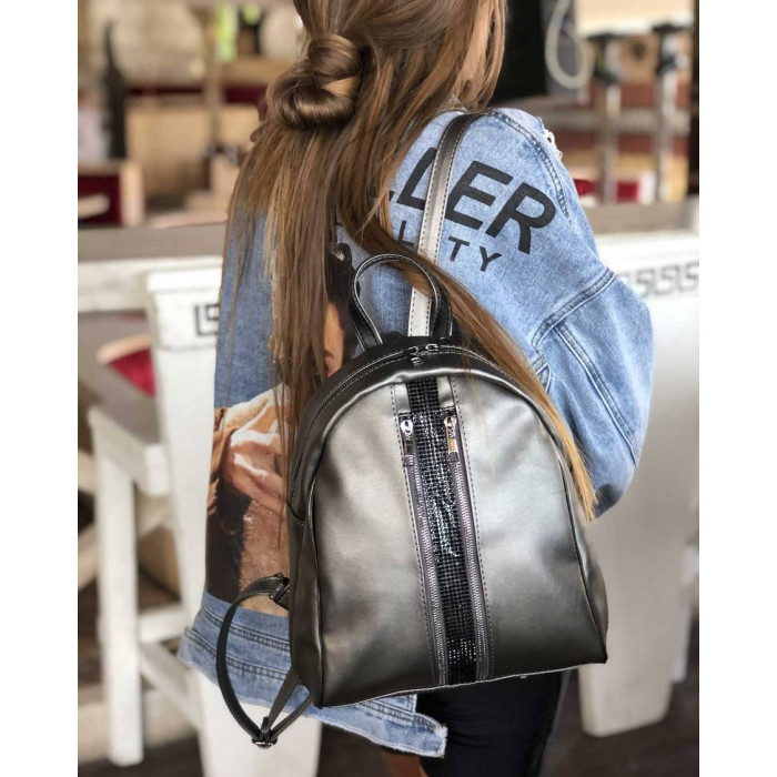Рюкзак прикрашений смужкою з чорних каменів, які переливаються на світлі.