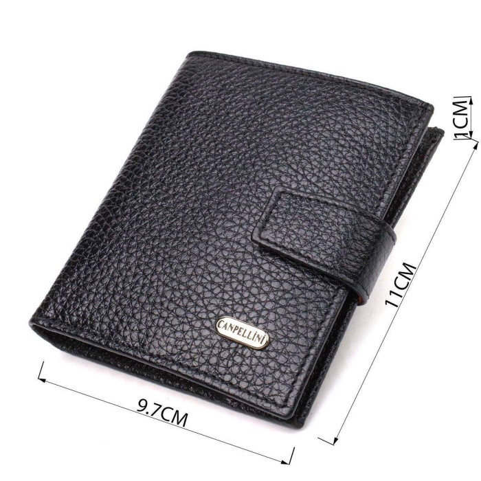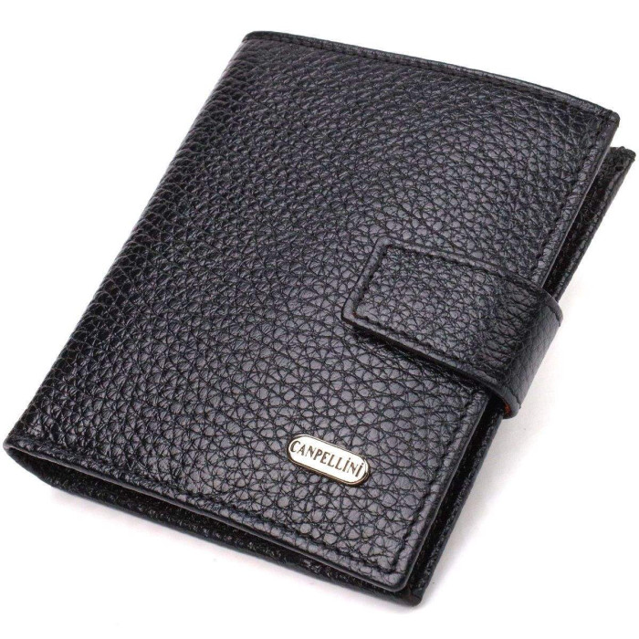 Компактний чоловічий гаманець із натуральної зернистої шкіри вертикального формату, чорного кольору зовні та червоного всередині. Аксесуар має основне відділення з перегородкою, п'ять відсіків для карток, дві прилеглі кишені, прозору кишеню для документів та монетницю. Закривається аксесуар хлястиком на кнопку. Відмінний аксесуар від надійного виробника, що прослужить дуже довго.
