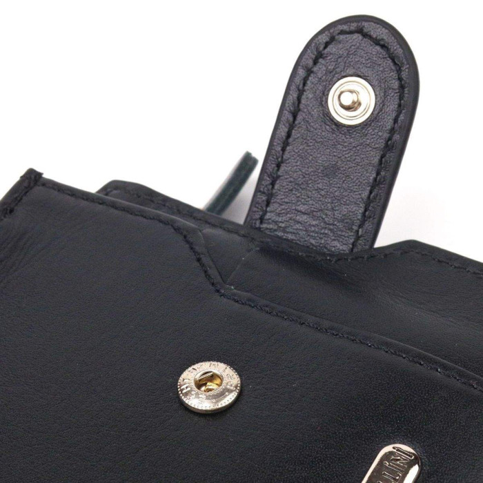 Стильне чоловіче портмоне з натуральної гладкої шкіри. Аксесуар має одне основне відділення з перегородкою, до якого вміщуються купюри всіх номіналів, дев'ять кишень для карток, дві з яких під сіточкою, монетницю на блискавці, п'ять прилеглих кишень, а також автономний блок для карт, який розташований в одній із прилеглих кишень. Закривається аксесуар хлястиком на кнопку. Колір фурнітури – срібло. Шкіряний гаманець є чудовим подарунком для рідних та близьких людей.