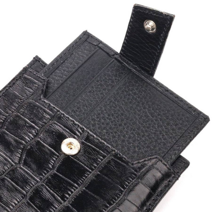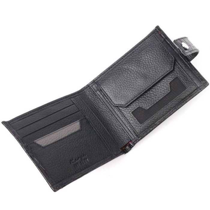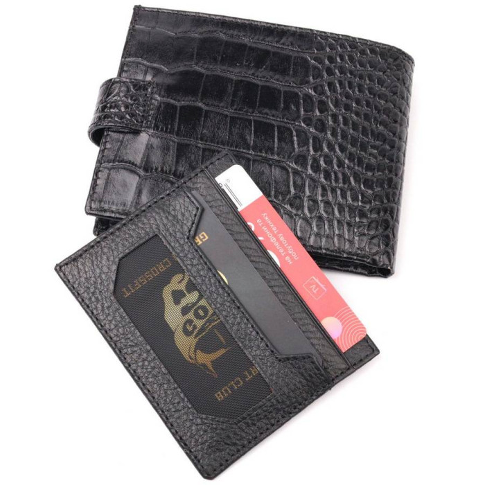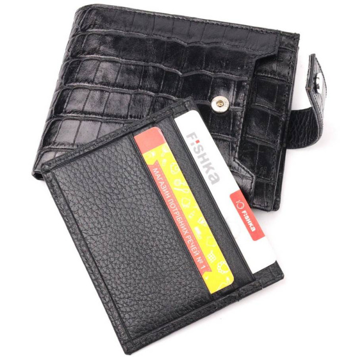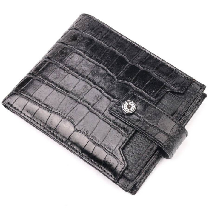 Класичний чоловічий гаманець із натуральної шкіри, в класичному чорному кольорі. Портмоне пошито з комбінації двох видів шкіри: фактурної шкіри під крокодила – зовні та зернистої шкіри – усередині. Із зовнішнього боку знаходиться кишеня з блоком під картки та документи. Закривається гаманець хлястиком із кнопкою. Має стандартний горизонтальний формат, поміщається в кишеню. Вироби з натуральної шкіри завжди будуть чудовим подарунком для близької людини.