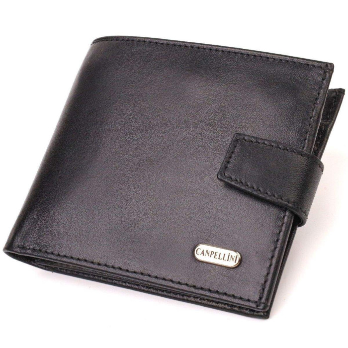 Класичний чоловічий гаманець із натуральної гладкої шкіри. Аксесуар має основне відділення для купюр, три осередки для карток, дві кишені під сіточкою, кишеню на блискавці через усю довжину та монетницю, що закривається клапаном на кнопку. Гаманець складається навпіл і закривається хлястиком на кнопку. На лицьовій стороні в правому нижньому кутку розташований металевий логотип компанії виробника. Багатофункціональний чоловічий гаманець з дуже міцної шкіри чудовий вибір подарунка для солідного чоловіка.