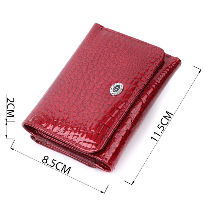 Жіночий яскравий гаманець із натуральної лакованої шкіри, з тисненням під рептилію. Модель має зручний розмір та закривається на магніт. Зовні можна побачити відділення монет, яке закривається клапаном на магніт. Аксесуар всередині оснащений двома відділеннями для купюр та вісьмома осередками для карт. Запакований аксесуар у білу щільну картонну коробку з фірмовим логотипом.