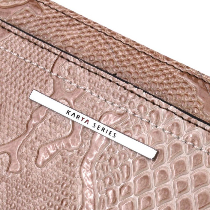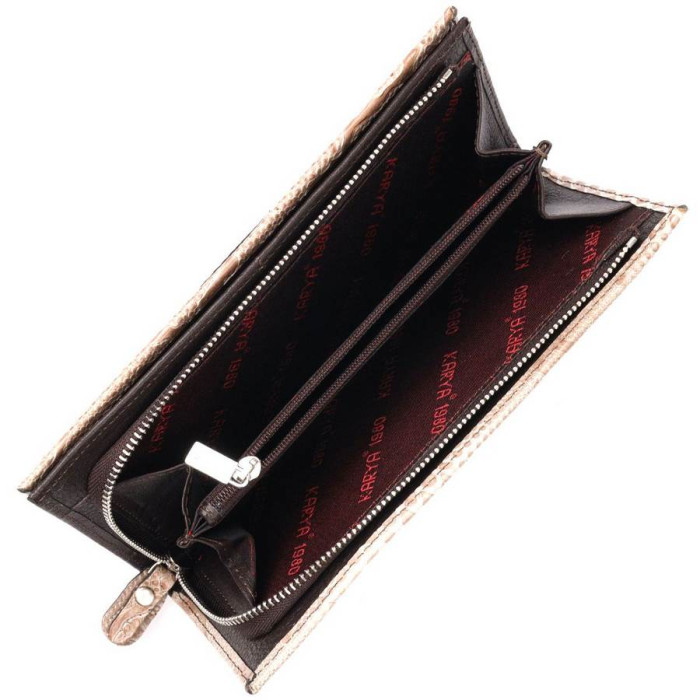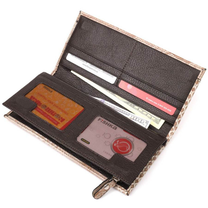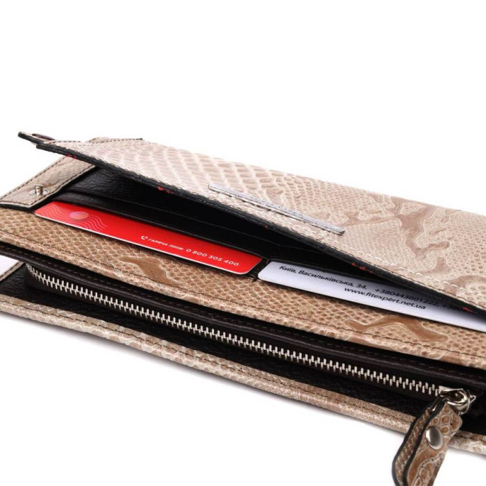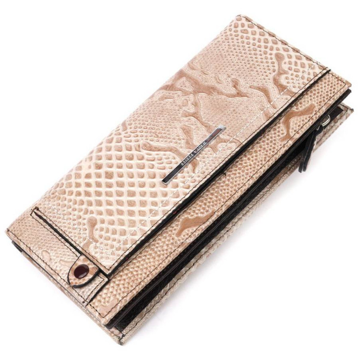 Стильний жіночий гаманець з лакованої натуральної шкіри, з тисненням під рептилію. На лицьовій стороні блок для карток, який прошитий білою ниткою для декору та закривається хлястиком на кнопку. Всередині відділення для карт і документів, що закривається на магніти. Відділення на блискавці для купюр без складання. Запакований аксесуар у фірмову коробку та пакет бренду. Вироби з натуральної шкіри завжди будуть чудовим подарунком для близької людини.