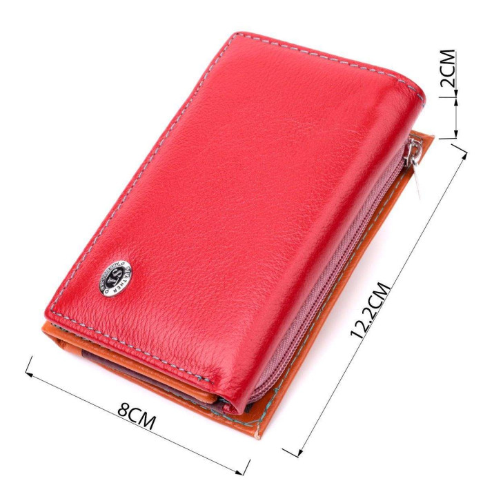 Яскраве жіноче портмоне в три складання з натуральної шкіри найвищої якості. Перше, що впадає в око це колірне рішення, замість однотонного аксесуара ми маємо різнокольоровий, який містить два основні зовнішні кольори і кілька додаткових всередині. Шкіряне портмоне дуже практичне і служить досить довго. Аксесуар складається з двох містких кишень для купюр, кишені на блискавці через всю довжину, п'яти осередків для карт, прозорого віконця для пропуску та зовнішньої кишені на блискавці з перегородкою, що чудово прослужить для монет. Портмоне доповнено надійною фурнітурою. Укомплектований гаманець у фірмову картонну коробку білого кольору.