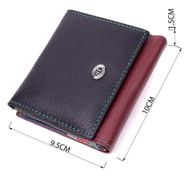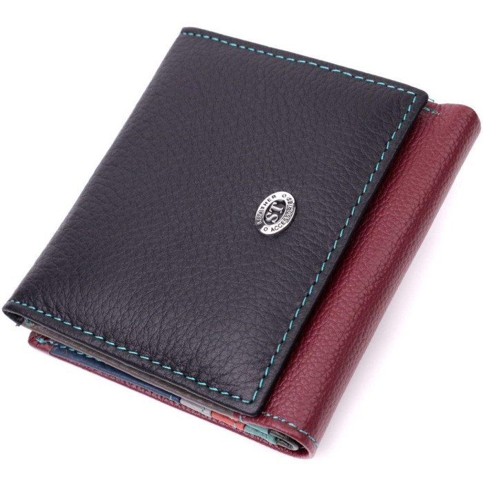 Жіноче гарне портмоне в два складання з натуральної шкіри найвищої якості. Фішкою цього гаманця є його багатобарвна гама, такий аксесуар одразу впадає у вічі, складається він з двох містких відділень для купюр, шести осередків для карт, двох прихованих кишень та кишені для монет. Зовні виріб прошитий рівним рядком бірюзового кольору по краю і прикрашений металевим логотипом компанії виробника. Портмоне доповнено надійною фурнітурою та міцною підкладкою. Укомплектований гаманець у фірмову картонну коробку білого кольору.