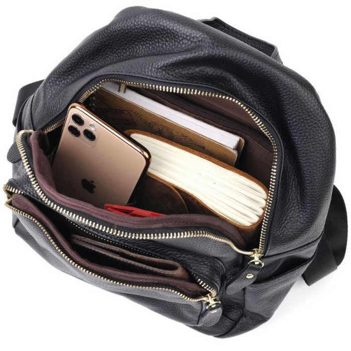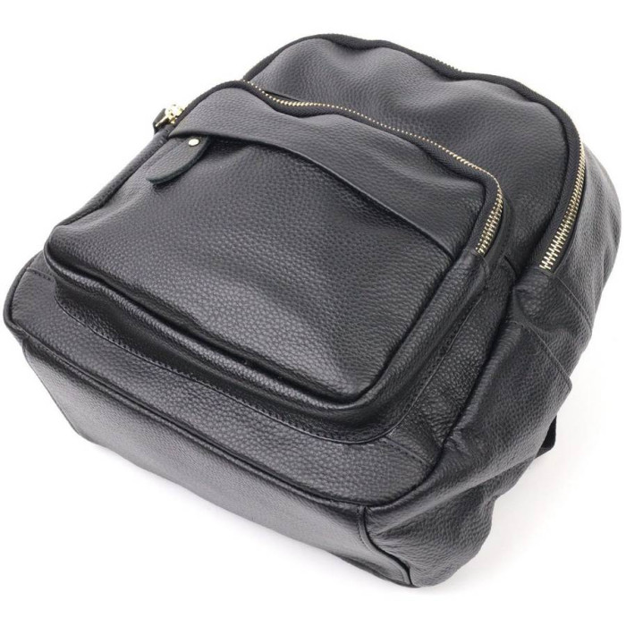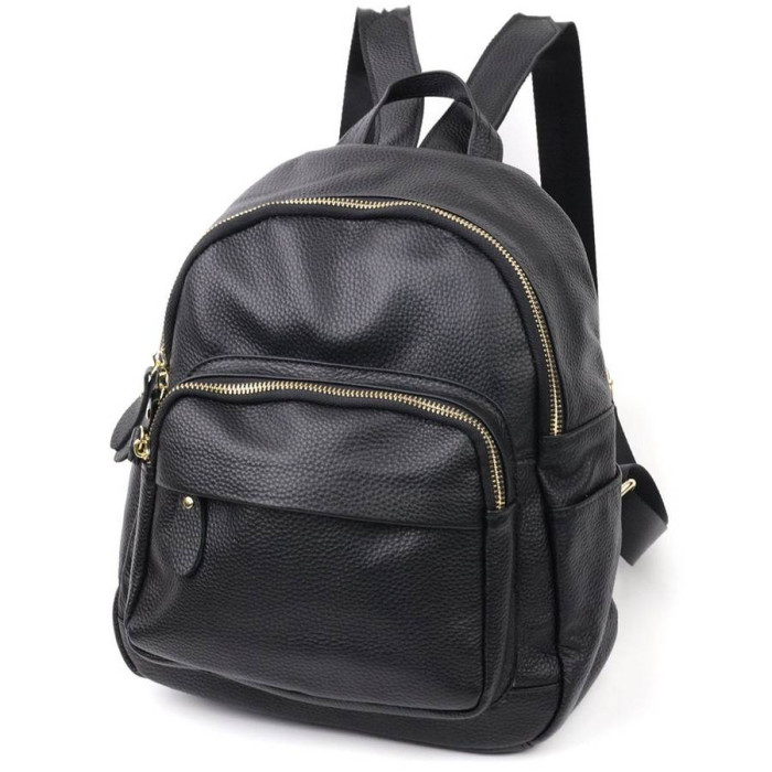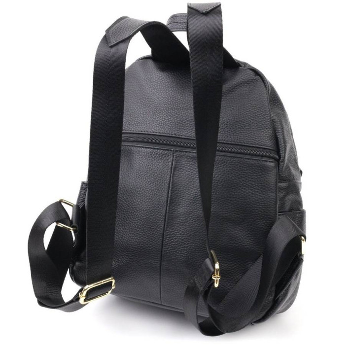 Стильний рюкзак компактного розміру з натуральної якісної шкіри. Має класичний чорний колір та зернисту фактуру. Фурнітура виконана у кольорі під золото. Модель довгий час залишається у ідеальному стані, такий рюкзак приємно носити. Може бути чудовим варіантом для подарунка близькій людині.