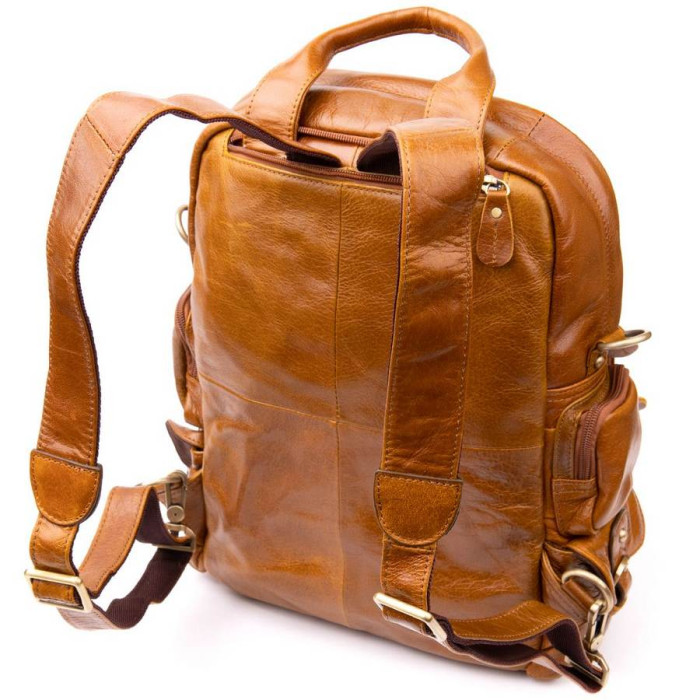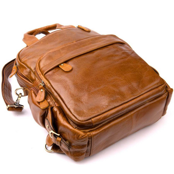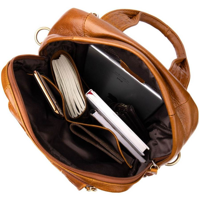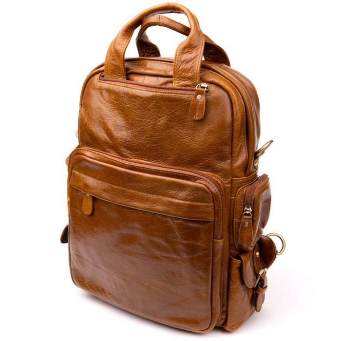 Мега функціональна шкіряна руда сумка-трансформер, яку можна носити трьома способами (як рюкзак, як дорожню сумку на плечі і в руках). Виріб красиво переливається на сонці. Доповнено аксесуар якісною фурнітурою. Всередині - якісна текстильна підкладка. З такою сумкою зручно буде відправитися в поїздку, і на кожен день. Шкіряна сумка прослужить вам далеко не один рік, а її функціонал не залишить вас байдужим. Виріб стане прекрасним подарунком для ваших близьких, а її ціна вас приємно здивує.