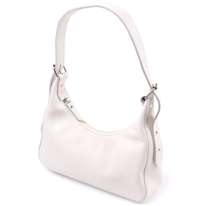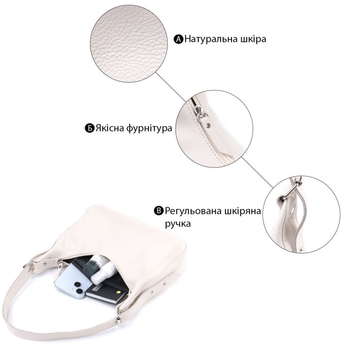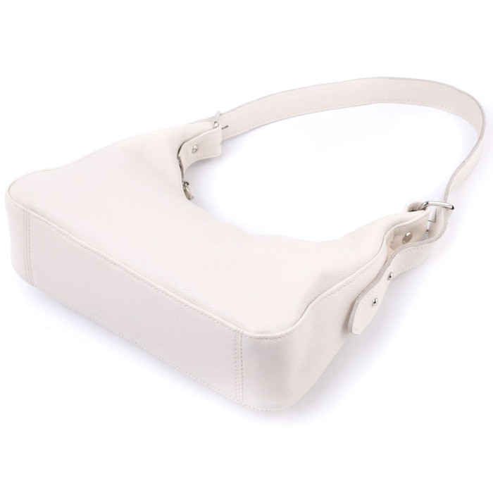 Жіноча сумка для тих, хто любить красивий дизайн без зайвих деталей. Така сумка у модному світі має назву – сумка багет. Це невелика сумка з коротким ременем, яку зручно носити під рукою, вона набула своєї популярності завдяки своєму універсальному дизайну та незвичайній формі. Колір виробу – благородний бежевий, фактура – зерниста. Матеріал виконання – натуральна шкіра з високими показниками якості. Відмінний варіант сумки на кожен день, адже вона не тільки приваблива зовні, але й оснащена розумною системою внутрішніх відділень, що дозволить організувати простір усередині.