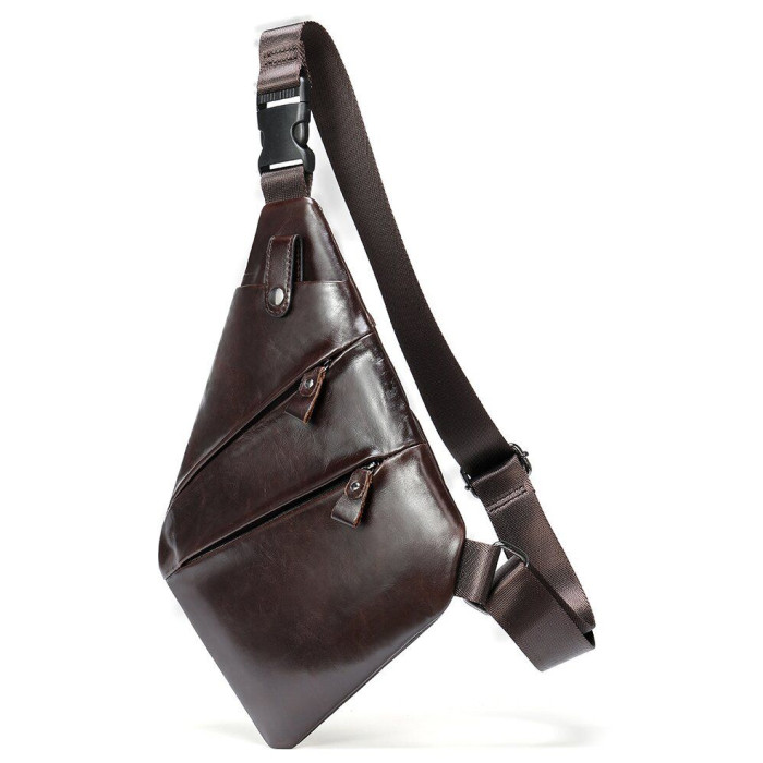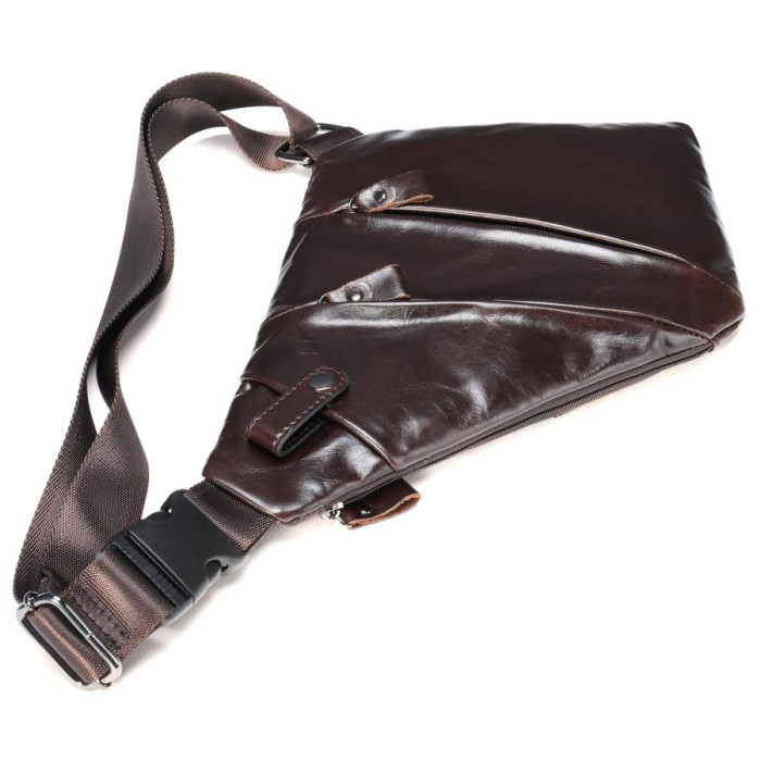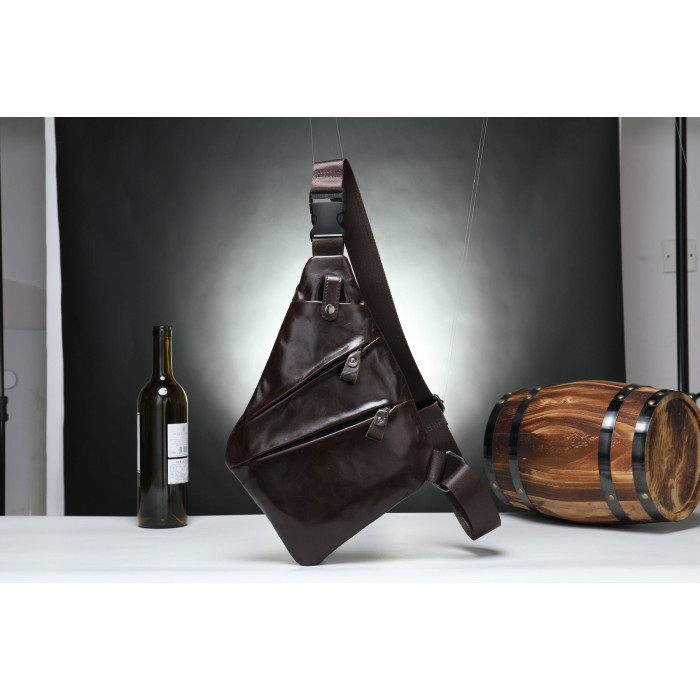 Чоловіча легка і універсальна сумка через плече з щільною і гладкої натуральної шкіри коричневого кольору стане бездоганною знахідкою для будь-якого чоловіка. Виріб красиво переливається на сонці. Модель ви можете використовувати замість барсетки, а чоловікам, які проводять багато часу за кермом така сумка просто необхідна. Бічна блискавка робить ваші особисті речі ще більш доступними. Сумка має оптимальний функціонал на кожен день. Виріб стане найкращим подарунком для ваших близьких.