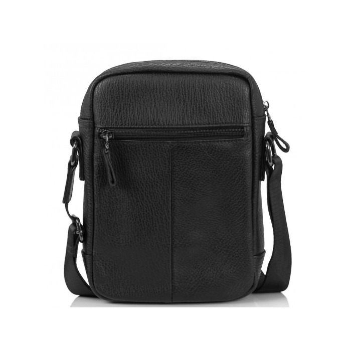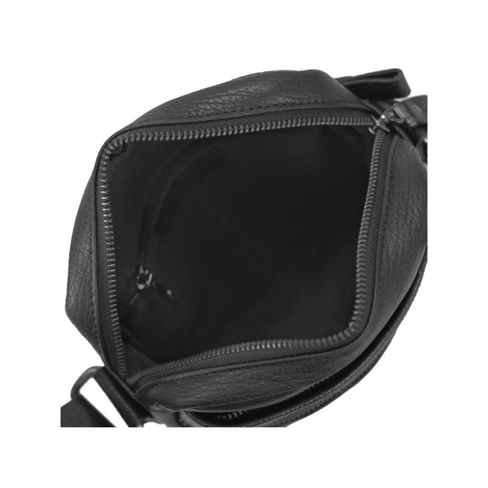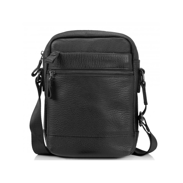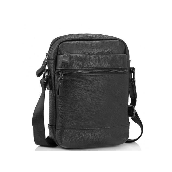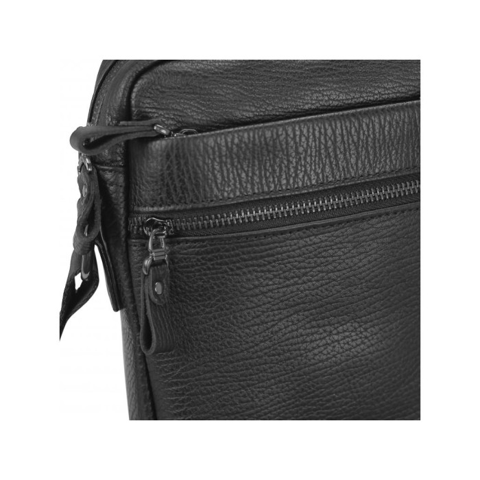 Шкіряна сумка з фактурної шкіри чорного кольору. Сумка оснащена темною фурнітурою і текстильним плечовим ременем, який регулюється по довжині. Має одне основне відділення. З лицьового боку є дві кишені на блискавці, з тильного боку також є кишеня. Усередині сумки кишеня на блискавці і кишеня відкритого типу для дрібниць.