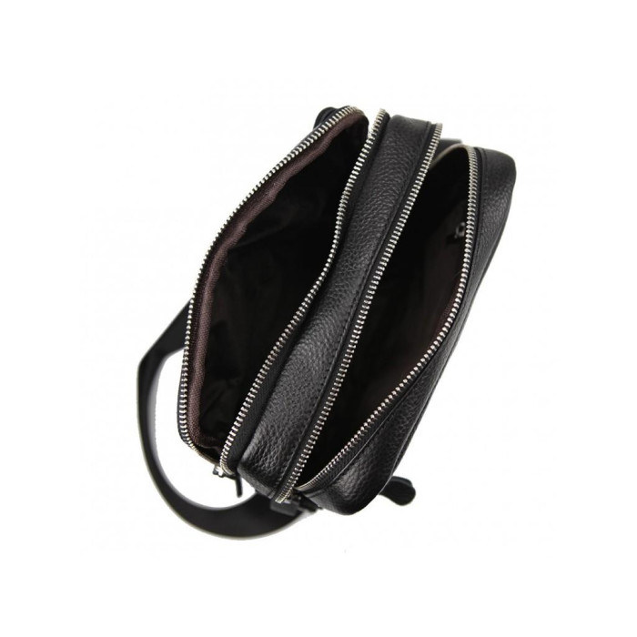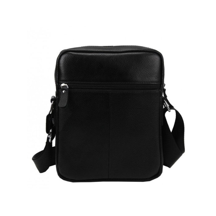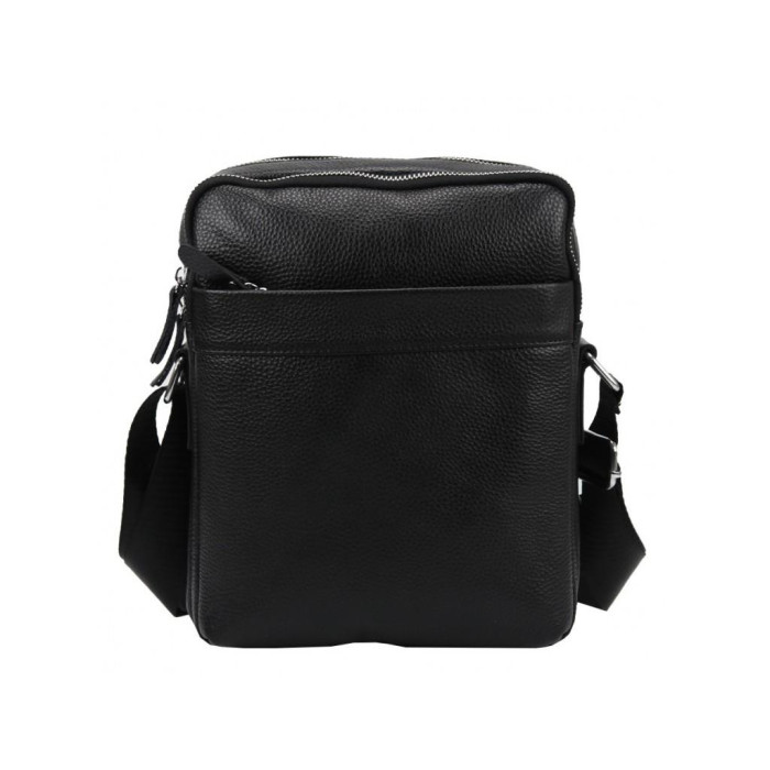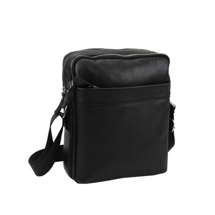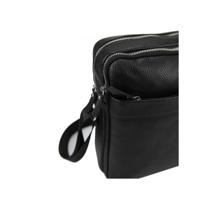 Чоловіча сумка через плече чорного кольору. У сумки є два основних відділення, всередині яких є маленька кишеня на замку і кишеню відкритого типу, а також з лицьової і тильної сторони є дві кишені на замку.