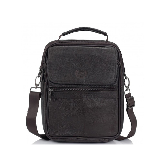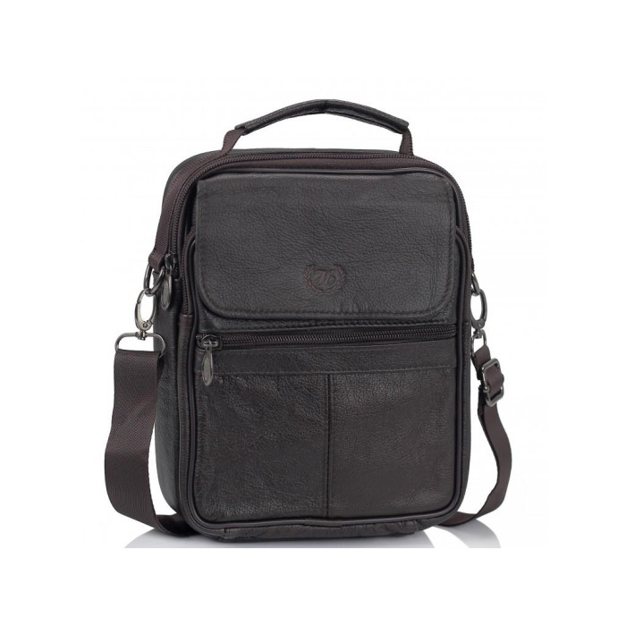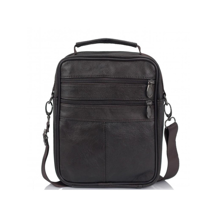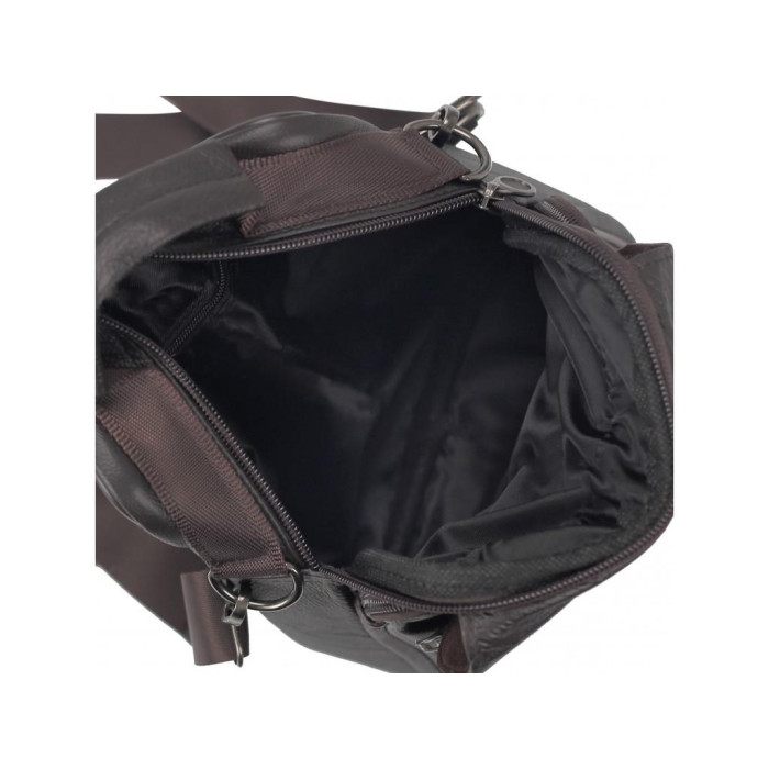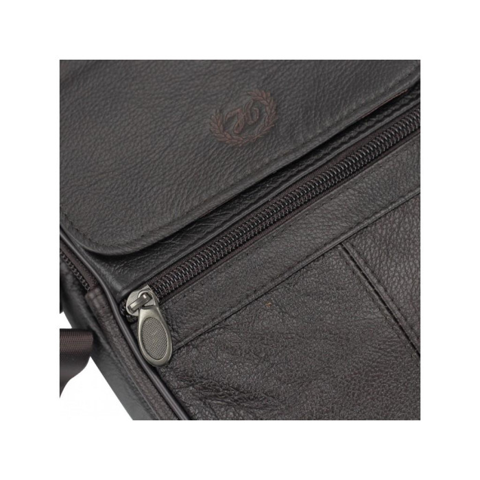 Коричнева сумка шкіряна через плече. Для перенесення є шкіряна ручка і текстильний плечовий ремінь. Усередині темна текстильна підкладка. Одне основне відділення. З лицьового боку дві кишені на блискавці, накриваються клапаном на липучці. З тильного боку дві кишені горизонтального типу. Усередині маленька кишеня на блискавці.