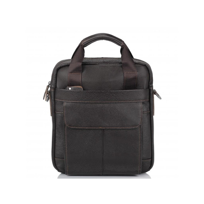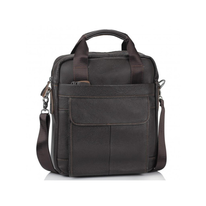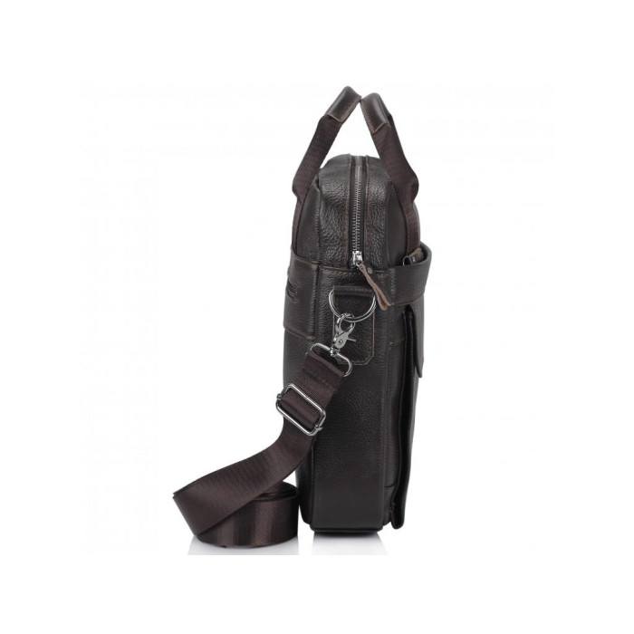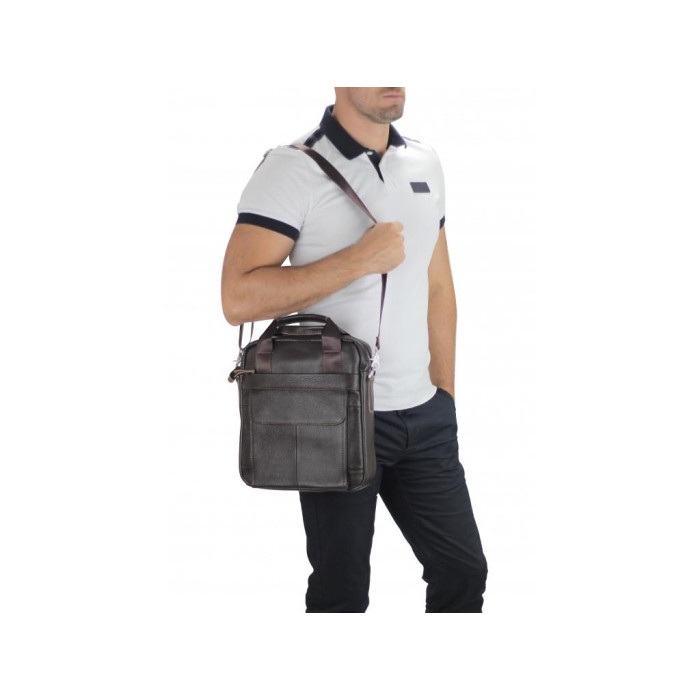 Мессенджер в коричневому кольорі. Чоловіча сумка на плече передбачає два варіанти носіння - в руках, завдяки ергономічним шкіряним ручкам і на плечі. Текстильна плечова шлейки регулюється по висоті і кріпиться на надійні металеві карабіни. Для дрібниць, передбачені дві кишені з лицьового боку і одна кишеня на блискавці з тильної частини сумки. Усередині основного відсіку підкладка з щільного текстилю, одна кишеня на блискавці і дві кишені відкритого типу.