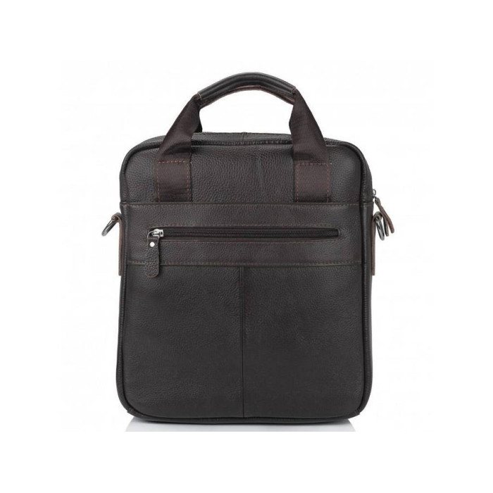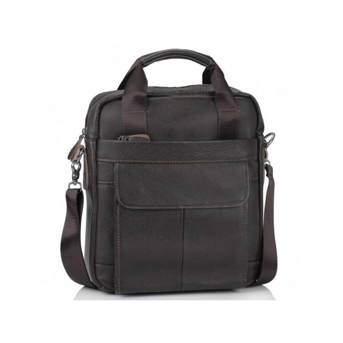 Мессенджер в коричневому кольорі. Чоловіча сумка на плече передбачає два варіанти носіння - в руках, завдяки ергономічним шкіряним ручкам і на плечі. Текстильна плечова шлейки регулюється по висоті і кріпиться на надійні металеві карабіни. Для дрібниць, передбачені дві кишені з лицьового боку і одна кишеня на блискавці з тильної частини сумки. Усередині основного відсіку підкладка з щільного текстилю, одна кишеня на блискавці і дві кишені відкритого типу.