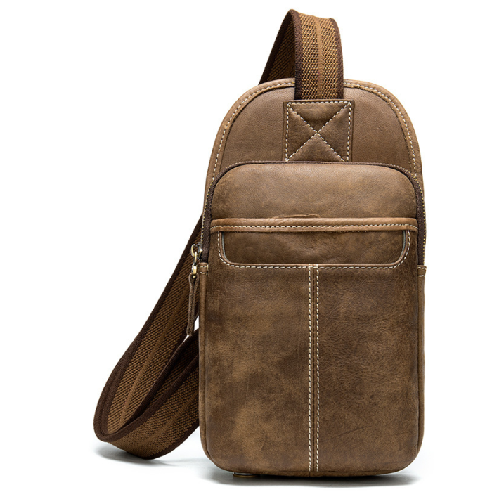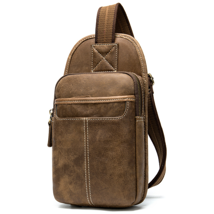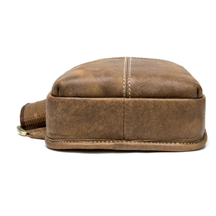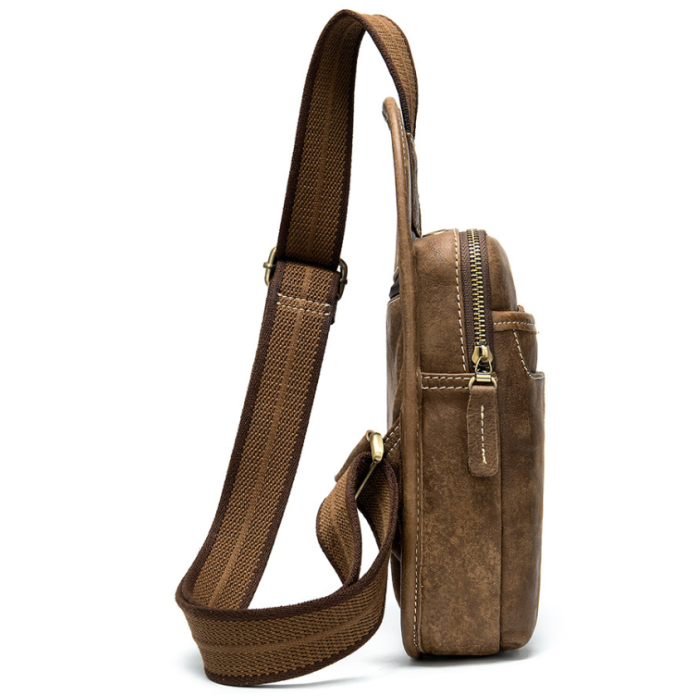 Практична шкіряна сумка через плече світло-коричневого кольору. Сумка дуже м'яка і приємна на дотик. Усередині сумки міцна текстильна підкладка коричневого кольору. Фурнітура кольору латунь. З такою сумкою зручно буде відправитися в поїздку, а також вона стане незамінним помічником для водіїв. По краях аксесуар прошитий світлою ниткою. Модель рівносильно підійде як чоловікові, так і жінці.