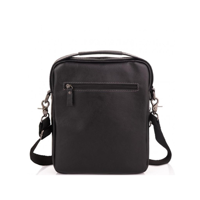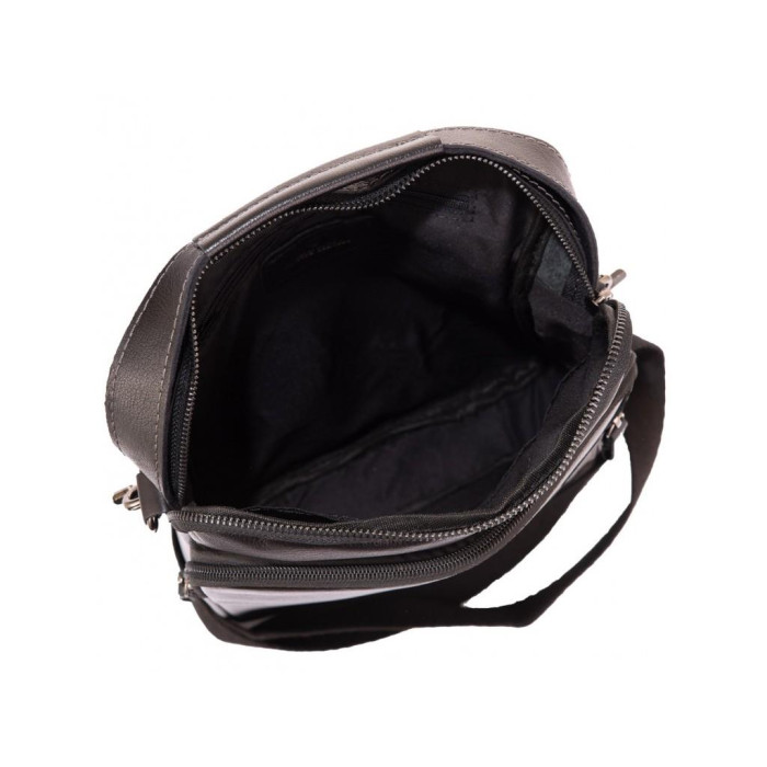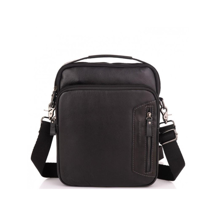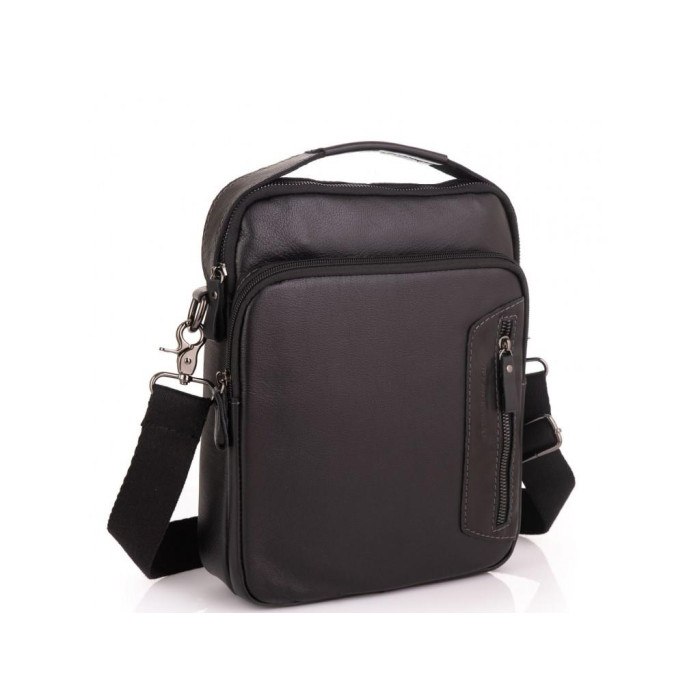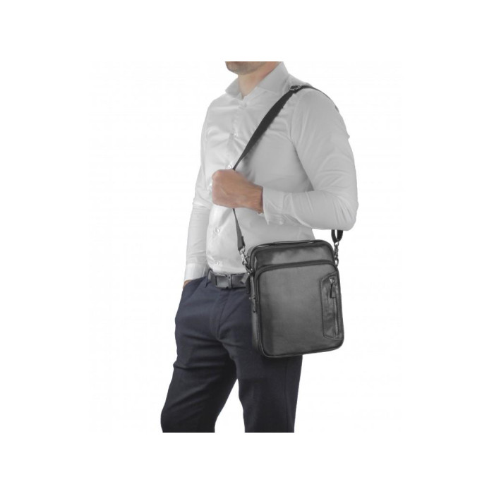 Шкіряна чорна чоловіча сумка через плече. Має надійну сріблясту фурнітуру і тканинний щільний плечовий ремінь, так само для носіння можна використовувати шкіряну ручку. Чоловіча сумка оснащена одним основним відділенням. З лицьового боку є накладна кишеня на блискавці і маленька кишеня вертикального типу, з тильного боку кишеню на блискавці. Усередині сумки кишеня на блискавці і дві кишені відкритого типу.