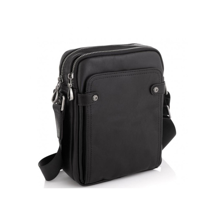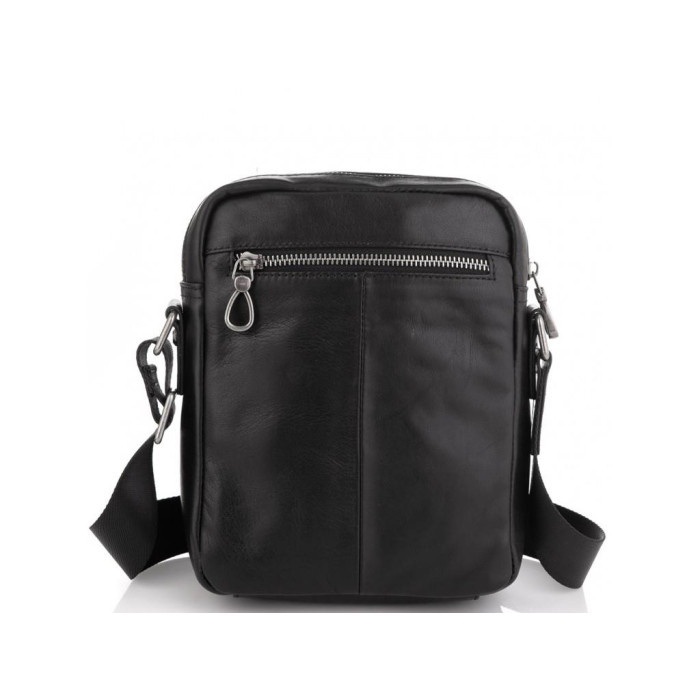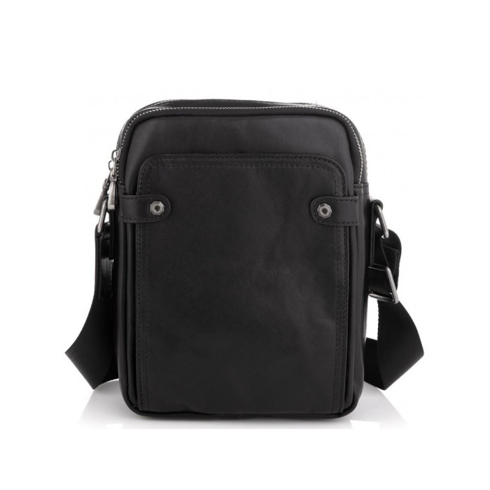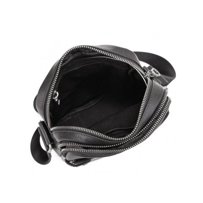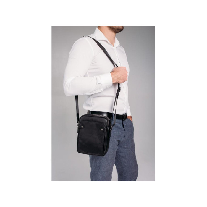 Чорна шкіряна сумка в гладкій шкірі. Сумка має стильний дизайн. Для носки передбачений текстильний ремінь, який регулюється по довжині. Фурнітура - металева, надійна. Чоловічий месенджер має два основних відділення. З лицьового боку є кишеня відкритого типу на прихованій магнітній кнопці, з тильного боку кишеня на блискавці горизонтального типу. Усередині основного відділення є кишеня на блискавці і кишеня відкритого типу для дрібниць.