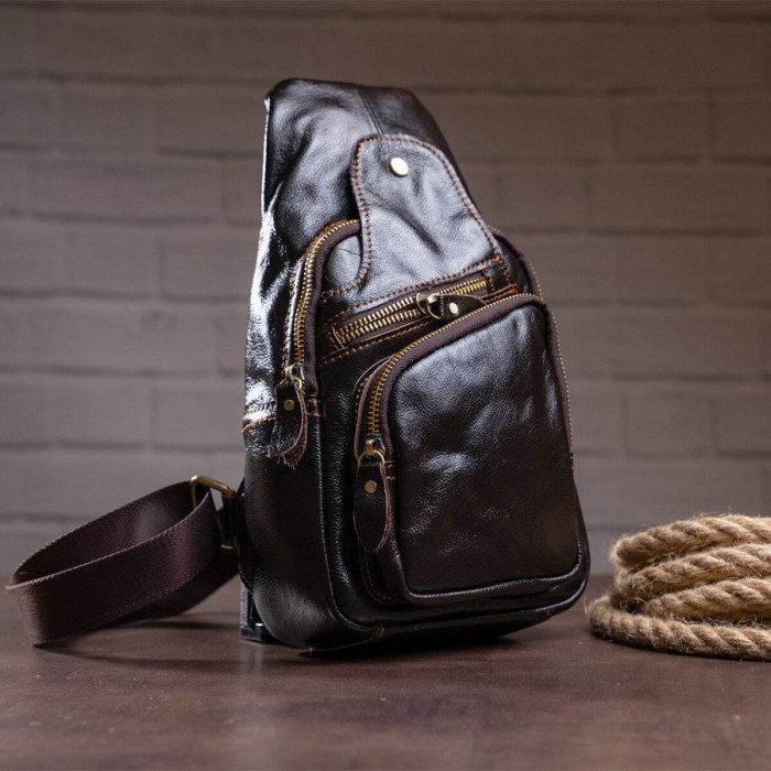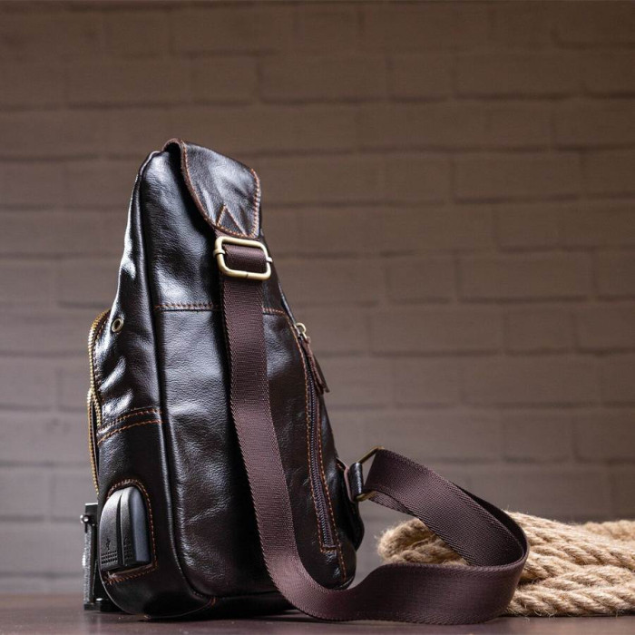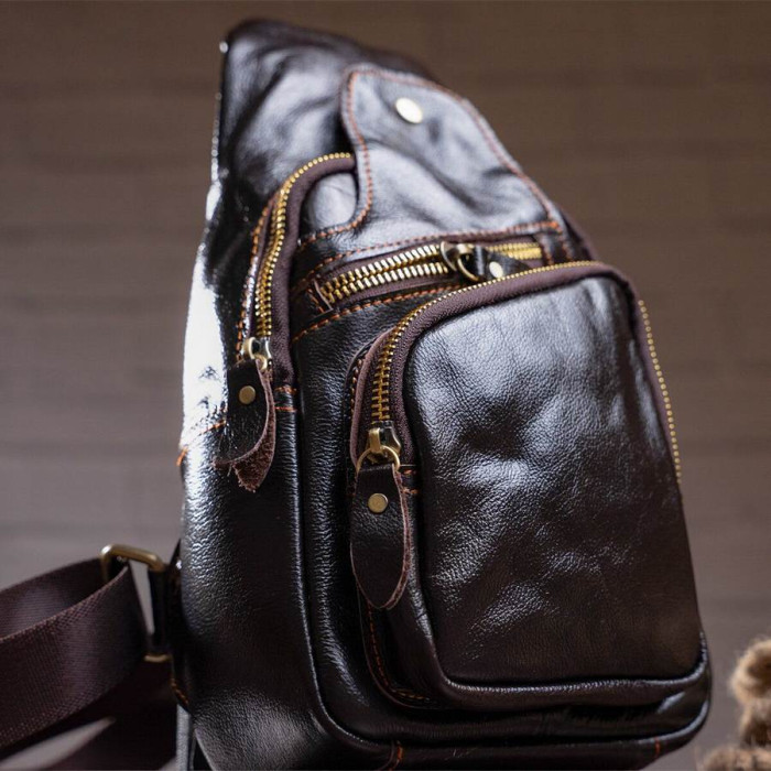 Сучасна модель сумки. Аксесуар оснащений всім необхідним для того, щоб вам було зручно використовувати свій гаджет. Сумка виконана з 100% натуральної шкіри, м'якої на дотик і доповнена якісною фурнітурою золотистого кольору. Усередині аксесуару міцна текстильна підкладка. Всі шви рівні й акуратні. Прошита світлою ниткою. Сумка виділяється оригінальним і неповторним дизайном. Вертикальна кишеня на задній стінці на блискавці. Носити сумку через плече. Текстильний ремінець легко регулюється під необхідну довжину. Така сумка легко впишеться в ваш образ і додасть вам практичності і завершеності. Прекрасний варіант для щоденного використання.