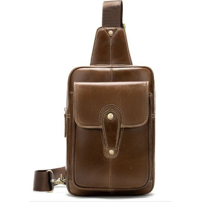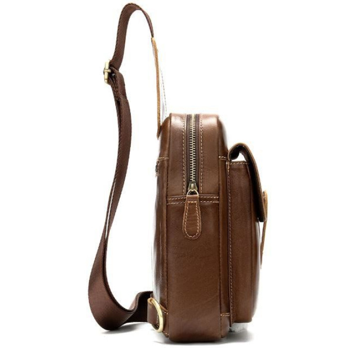 Оригінальна модель сумки для справжнього чоловіка. З такою сумкою вам буде зручно і комфортно ходити. Виріб виконано з 100% натуральної шкіри, м'якої на дотик і доповнена якісною фурнітурою золотистого кольору. Усередині аксесуару міцна текстильна підкладка. Всі шви рівні й акуратні. Прошита світлою ниткою. Сумка виділяється незвичайним дизайном. Носити сумку потрібно через плече. Текстильний ремінець легко регулюється під необхідну довжину. Така сумка легко підійде під ваш образ і додасть вам практичності і завершеності. Прекрасний варіант для щоденного використання.