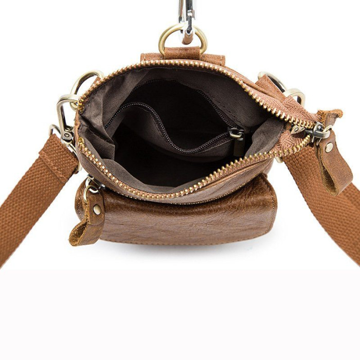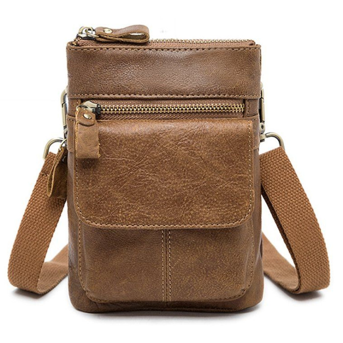 Компактна чоловіча сумка на кожен день. Сумка приємна на дотик і виглядає по вінтажному. Аксесуар має потертості, що надає йому ефекту старовини. Модель доповнена міцною золотистою фурнітурою в дизайн аксесуара. У комплекті йде зйомний текстильний ремінь коричневого кольору, а також карабін для вашої зручності. Ви також можете причепити на нього ключі. Усередині коричнева підкладка з якісного текстилю. Сумка прослужить не один рік і буде ідеальним подарунком з будь-якого приводу.