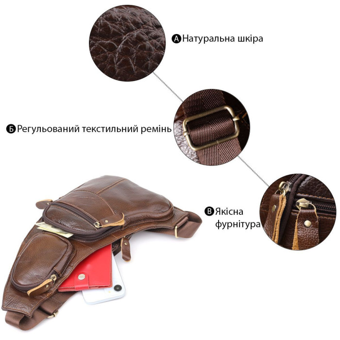 Ця шкіряна сумка через плече з великою кількістю кишень — універсальний аксесуар для активного життя, який поєднує зручність, стиль і якість.