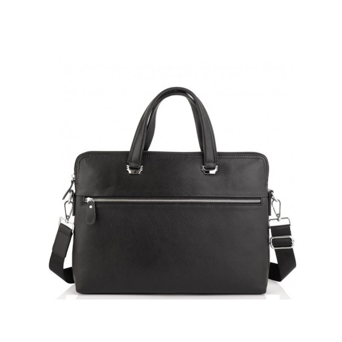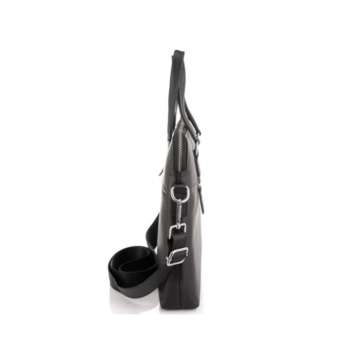 Сумка для ноутбука шкіряна в зернистій шкірі. Для зручного транспортування є шкіряні ручки і текстильний плечовий ремінь, який регулюється по довжині, фурнітура - срібного кольору, пуллера - шкіряні. Сумка має одне основне відділення, з лицьової і тильної сторони розміщені кишені на блискавці горизонтального типу. Усередині сумки кишеня на блискавці і кишеня на липучці для гаджета.