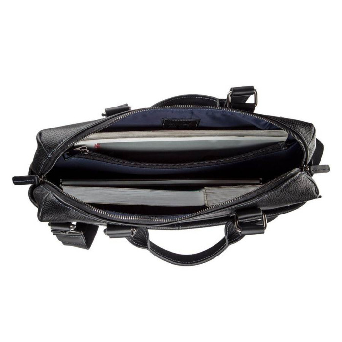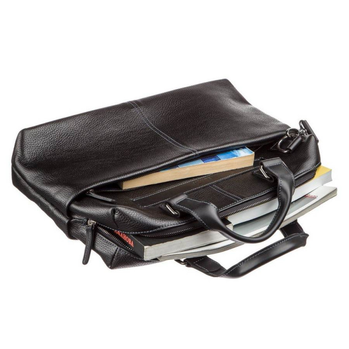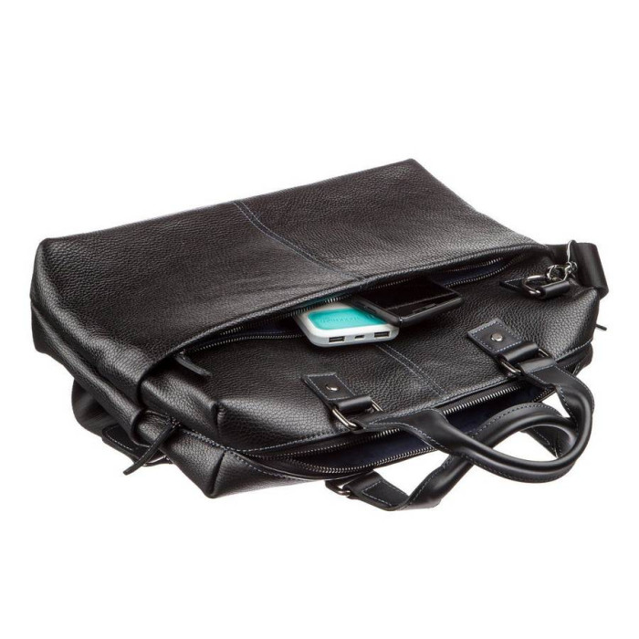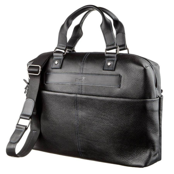 Відмінна чоловіча ділова сумка з двома зручними шкіряними ручками, з натуральної шкіри флотар. Виріб для повсякденного використання, що дозволяє носити з собою папку з документами, особисті речі. Виріб закривається на блискавку. В наявності знімний плечовий ремінь, колір фурнітури: темне срібло, підкладка виконана з міцного матеріалу, стильного синього кольору. Аксесуар упакований в пилозахисний чохол.