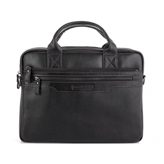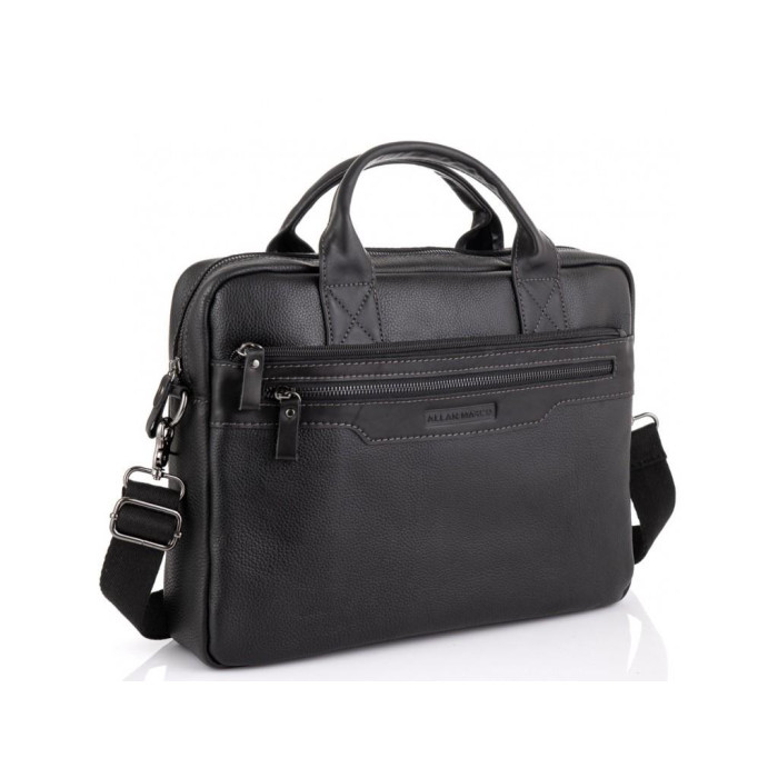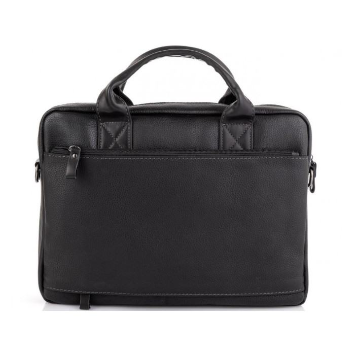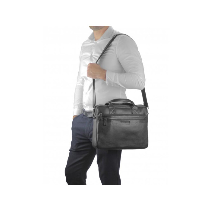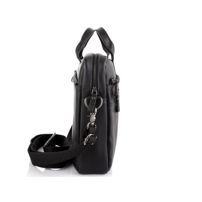 Чоловіча сумка для ноутбука чорного кольору з натуральної шкіри зернистої структури. Плечовий ремінь - текстильний, регулюється по довжині, також є гумова накладка на плече. Фурнітура темного срібного кольору, є ручки для носіння в руці. Усередині сумки - одне основне відділення, кишеня на замку, велика кишеня відкритого типу на кнопці і дві маленькі кишені відкритого типу. З лицьового боку сумки - дві кишені на замку, з тильної - одна кишеня на замку.