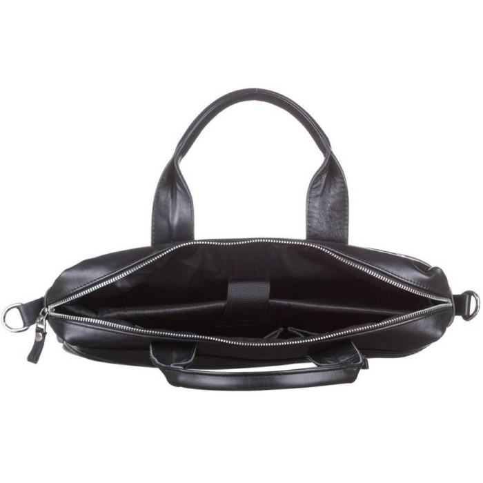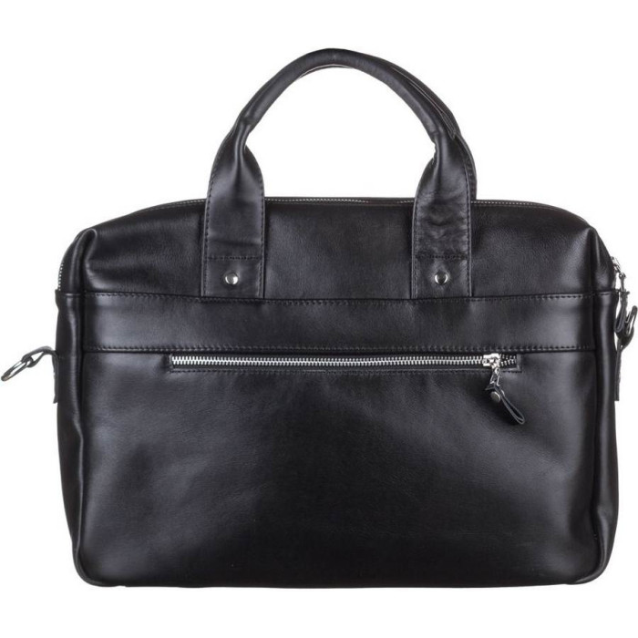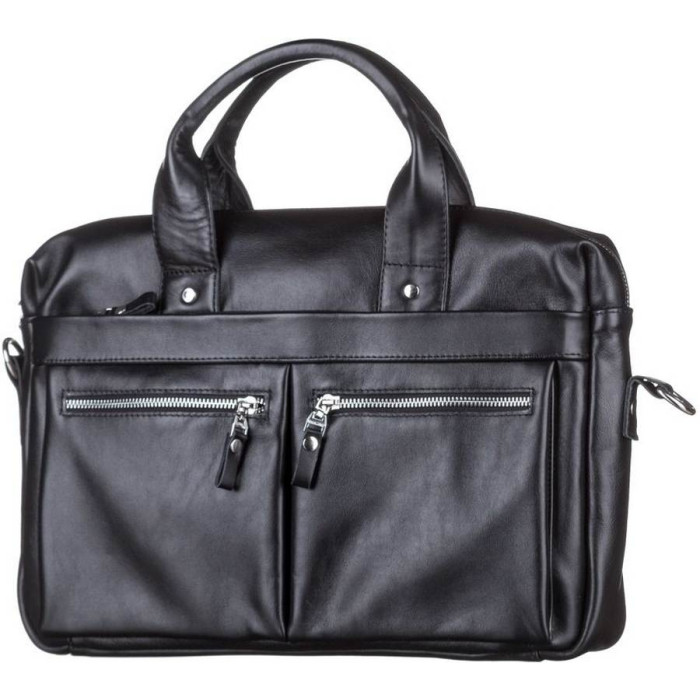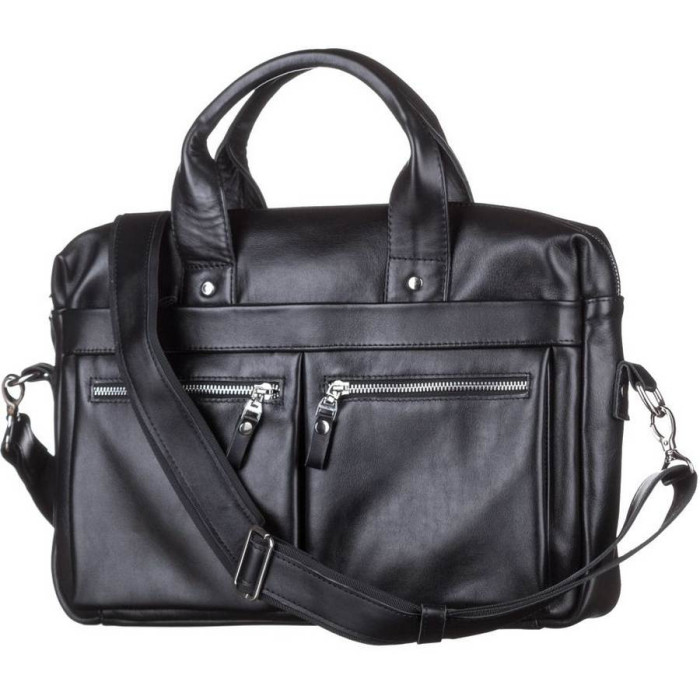 Красива чоловіча сумка з відділенням для невеликого ноутбука, а також документів формату А4. Аксесуар виконаний з натуральної гладкої шкіри чорного кольору. На лицьовій стороні даного вироби розташовані одне відділення і дві кишені на металевих блискавках. На задній зовнішній стороні знаходиться ще одне відділення на блискавці. Сумку можна переносити в руці за допомогою зручних шкіряних ручок, а також через плече (в комплекті є, регульований плечовий ремінь, який виконаний в комбінації текстильного матеріалу та натуральної шкіри). Колір фурнітури: срібло.