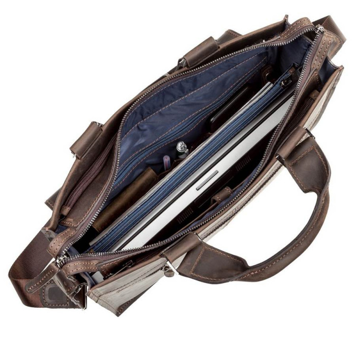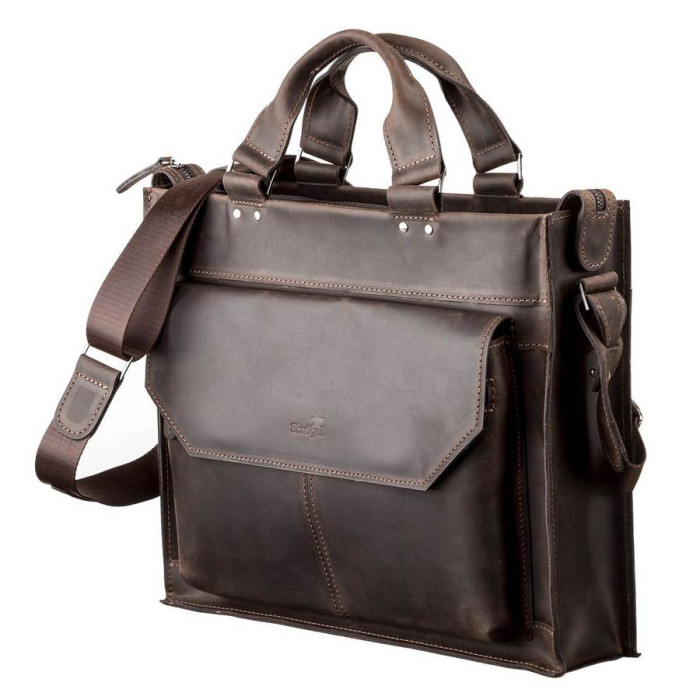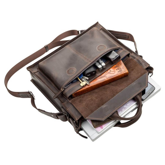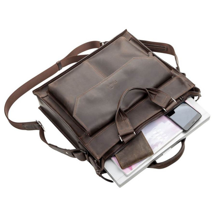 Відмінна чоловіча сумка-портфель з двома зручними ручками, з натуральної вінтажної шкіри, характерними ознаками якої є: неоднорідність забарвлення і потертості, які надають виробу вишуканого, індивідуального виду. Виріб для повсякденного використання, що дозволяє носити з собою папку з документами, особисті речі. Виріб складається з трьох великих відділів, що закриваються на блискавки. Усередині центрального великого відділу: кишеня-перегородка на блискавці, бічна кишеня на змійці, універсальна кишеня для двох телефонів, дрібниць і ручок, тримач для ключів, ущільнене відділення для планшета, на кнопці.