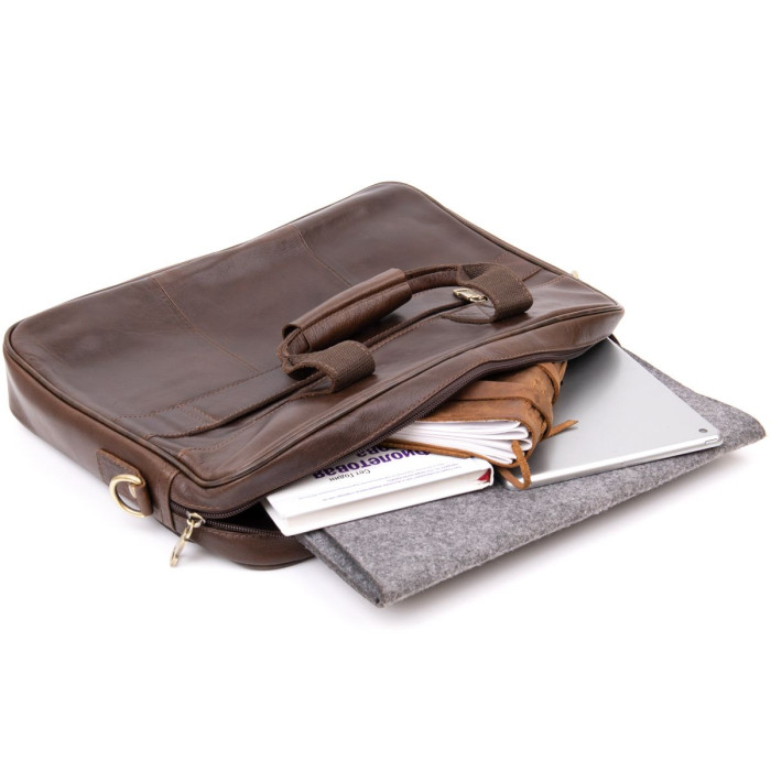 Солідна сумка ділової людини. В сумку поміститься ноутбук та інші документи або папки з діловими паперами. Виріб дуже функціональний. Сумка виконана в м'якій шкірі. Носити її ви можете як в руках (ручки скріплюються накладкою з кнопками), так і на плечі. Сумка зовсім невибаглива в догляді. Поверхня шкіри гладенька. У поєднанні з якісною фурнітурою сумка прослужить вам дуже довго і стане вашим ідеальним помічником на зустрічах і нарадах. Сумка стане найкращим подарунком для будь-якого ділового чоловіка.