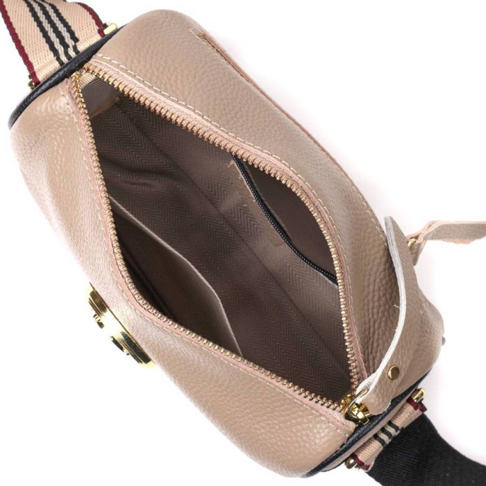 Сумка для стильних жінок із натуральної шкіри з високим показником якості та зносостійкості. На лицьовій стороні розташована кругла прикраса з камінчиками, що надає сумці стильного та вишуканого вигляду. Аксесуар складається з одного основного відділення, потайної кишені на блискавці, кишені відкритого типу та кишені на блискавці зовні. Носити сумку можна на плечі і через плече, для цього є текстильний ремінь, що не знімається. У виробі використано якісну фурнітуру кольору жовтого золота. Універсальний варіант сумки як на вечір так і як сумочка на кожен день.