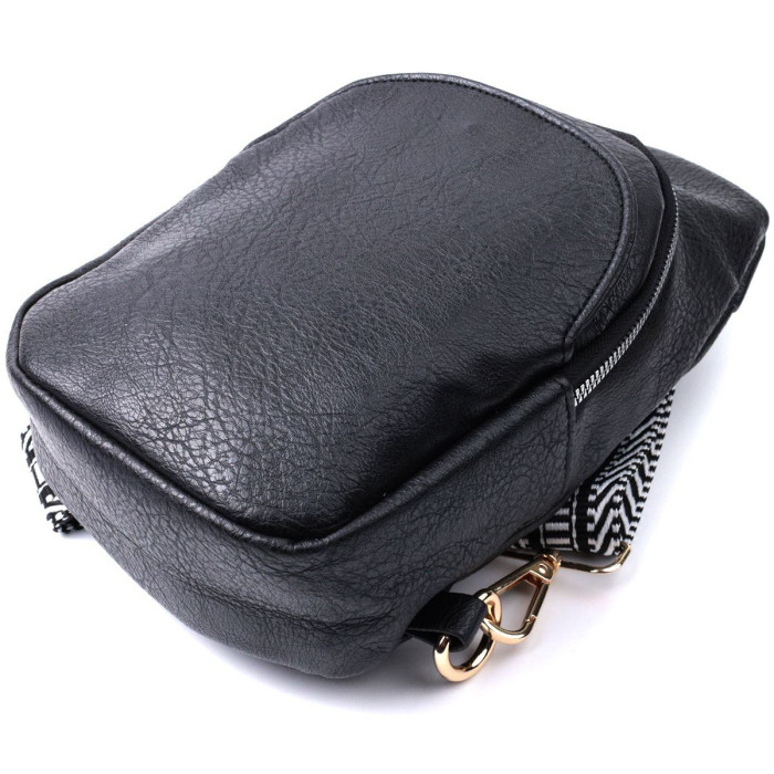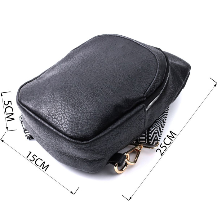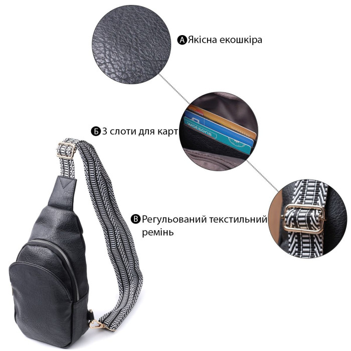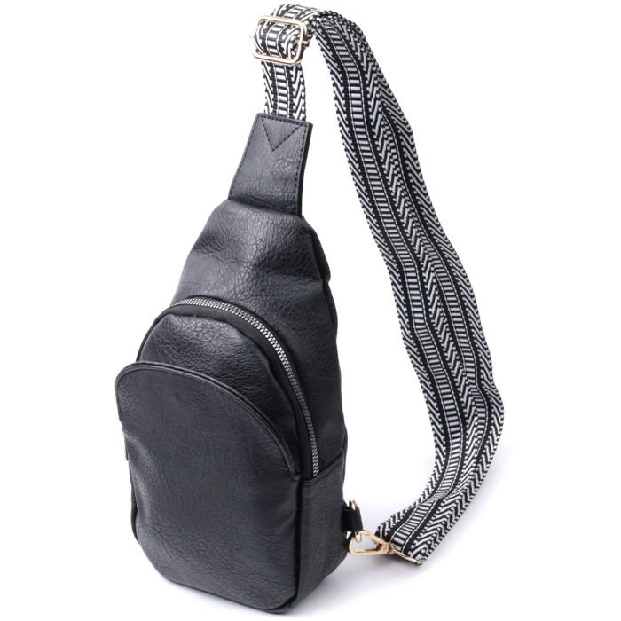 Жіноча сумка через плече з якісної екошкіри у класичному чорному кольорі. Дана модель складається з одного основного відділення, яке закривається на блискавку і в якому знаходиться потайна кишеня на блискавці і три осередки для кредитних карток усередині, а також однієї кишені зовні, на лицьовій стороні. Акцентом даної моделі є зручний регульований плечовий ремінець у етнічному стилі, що дуже модно вже кілька сезонів. Екошкіра – високоякісна альтернатива натуральному матеріалу, яка дуже стійка до тертя, до низьких температур, відмінно носиться на відміну від інших штучних матеріалів, а також має гіпоалергенний склад на відміну від натуральної шкіри. Практичний варіант сумки, який порадує будь-яку дівчину, тому що всі речі під рукою та в безпеці.