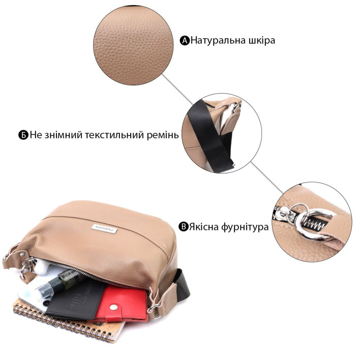 Красива сумка жіноча на плече з натуральної шкіри, яка дуже добре носиться і не втрачає свій первісний вигляд з часом. Аксесуар складається з основного відділення, потайної кишені на блискавці та кишені відкритого типу, а також кишені на блискавці зовні. Носити сумку зручно через плече. В аксесуарі використано якісну фурнітуру кольору срібла. Чудовий варіант сумки на кожен день.