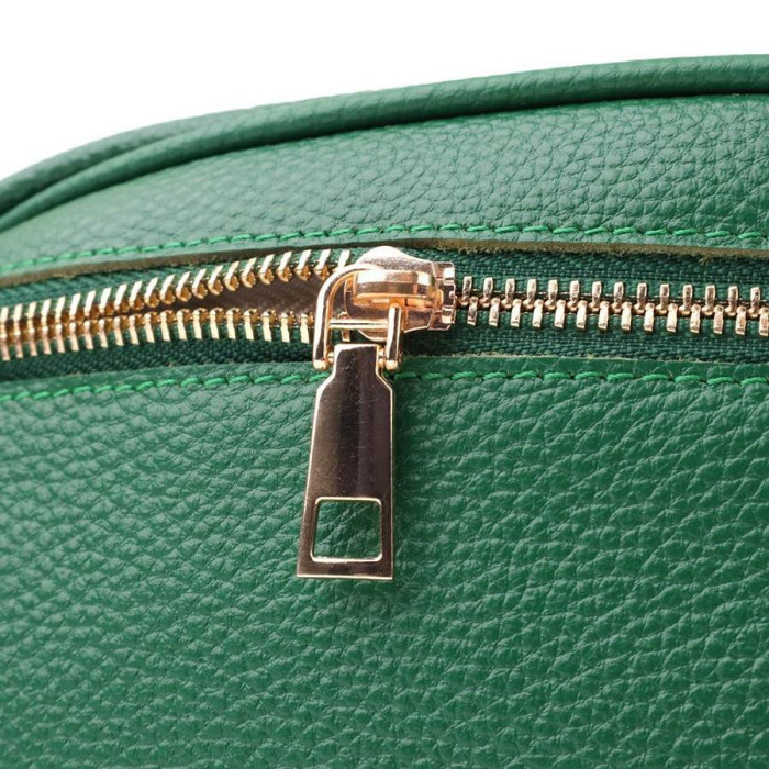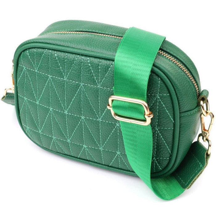 Стильна зелена стьобана сумка Vintage із натуральної шкіри стане стильним доповненням вашого образу, підкреслюючи індивідуальність та витончений смак. Компактна форма надає моделі акуратного та вишуканого вигляду, а стібка на лицьовій стороні робить дизайн більш виразним. Сумка закривається на блискавку, всередині розташоване основне відділення з кишенею на блискавці та відкритою кишенею для дрібниць, а на тильній стороні знаходиться зовнішня кишеня на блискавці для зручного доступу до потрібних речей. Знімний текстильний ремінь, що регулюється, забезпечує комфорт при носінні, а фурнітура під жовте золото гармонійно поєднується з глибоким зеленим відтінком шкіри. Така сумка стане універсальним аксесуаром як для повсякденних виходів, так і для особливих випадків, додаючи образу елегантності та стилю.