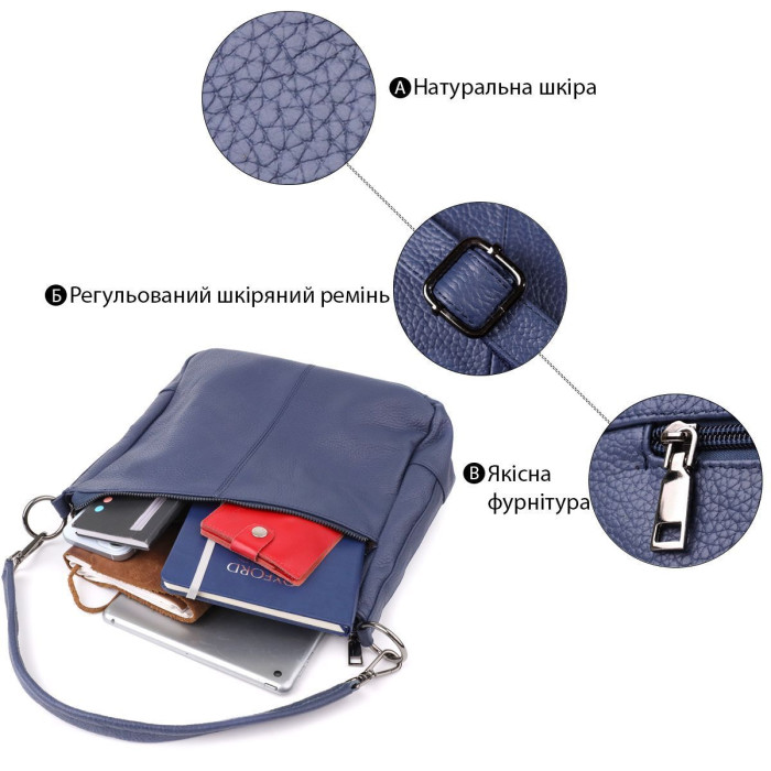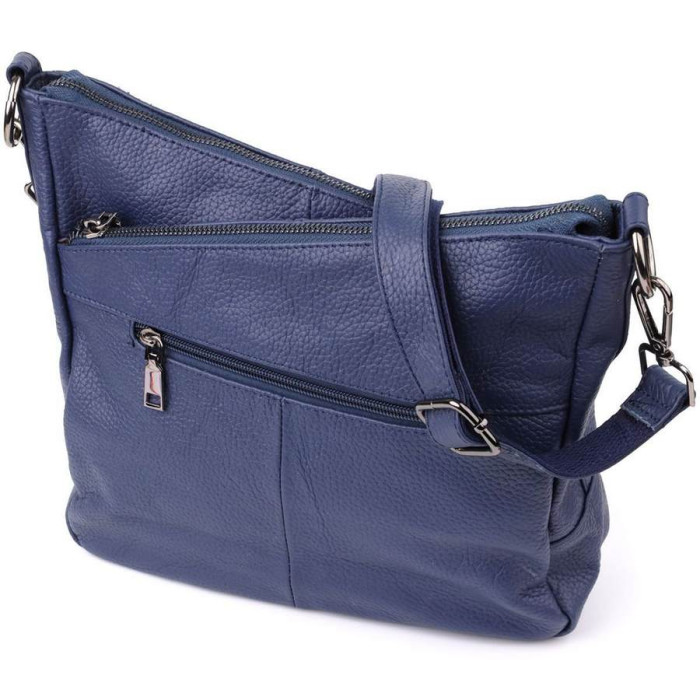 Синя шкіряна сумка з трьома відділеннями - це гармонійне поєднання стилю, практичності та якості, яке підкреслить ваш смак та підійде під будь-який гардероб.