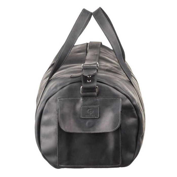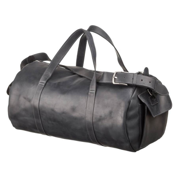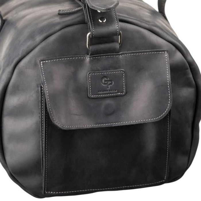 Міцна чорна дорожня сумка виконана виключно з цільної товстої, якісної, вінтажної шкіри, характерними ознаками якої є: неоднорідність забарвлення і потертості, які надають виробу вишуканого, індивідуального виду. Сумка поєднує в собі мінімалізм і функціональність. Вся фурнітура вищої якості, в сумці немає картону, немає підкладкових тканин, форма вироби зберігається завдяки пружності самої цільної шкіри. Завдяки цьому виріб має високу зносостійкість і благородний зовнішній вигляд.